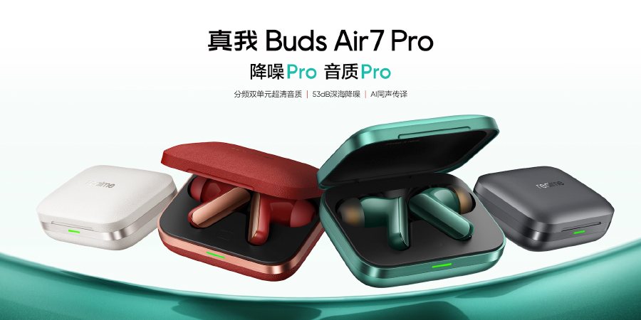 同时这次还有真我 Buds Air7 Pro 亮相,它有 4 种配色,有素皮和航空铝材质可选,它提供了 53dB 深海降噪,而综合续航达到了 48 小时,另外它还支持 AI 智慧翻译功能。它的定价是 449 元。