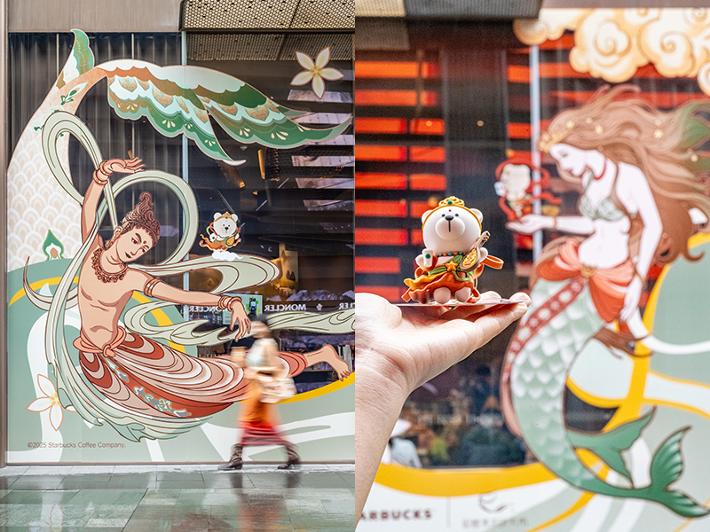 既然在太古里了,也可以顺带去星巴克旗舰店看看,在之前“金桂大赏”联动主题店的布置后,趁着 9 月底星巴克推出和敦煌美术研究所合作的联名系列,这家店也换上了全新的主题设计,成为全国超过 100 家主题设计店铺之一。这套设计会持续到国庆假之后。
