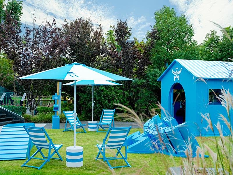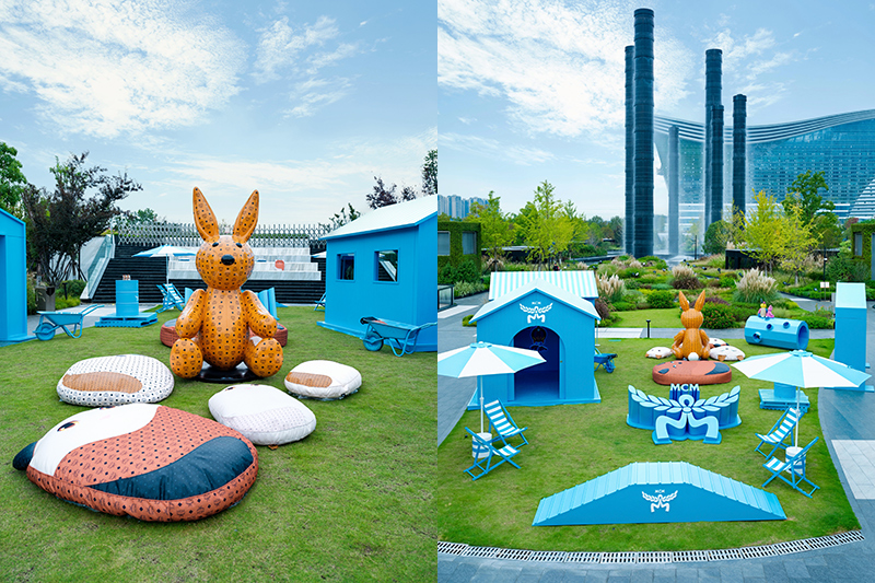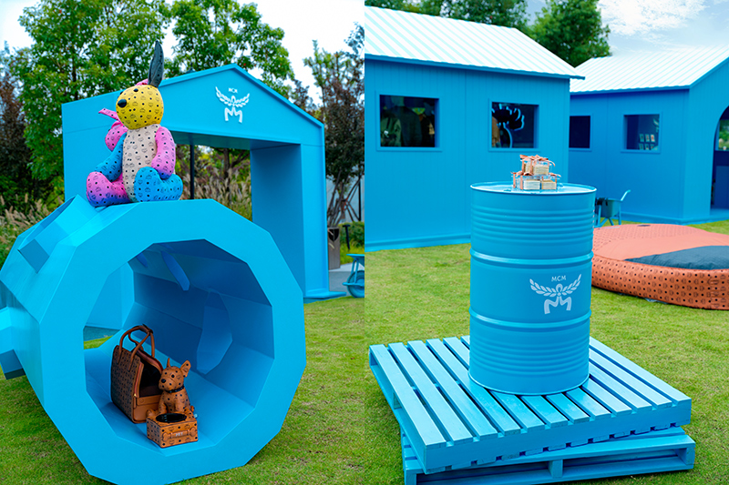 在 SKP,9 月底 MCM 带来了一波宠物友好快闪活动,这是在 SKP 花园层星空露台呈现的“臻宠秘境”。整个区域大量采用了天蓝色,同时准备了宠物隧道、攀爬阶梯等各种宠物游乐设施,空间中还有各种潮流陈列和趣味装置提供给“毛孩子”和主人们尝试与探索。
