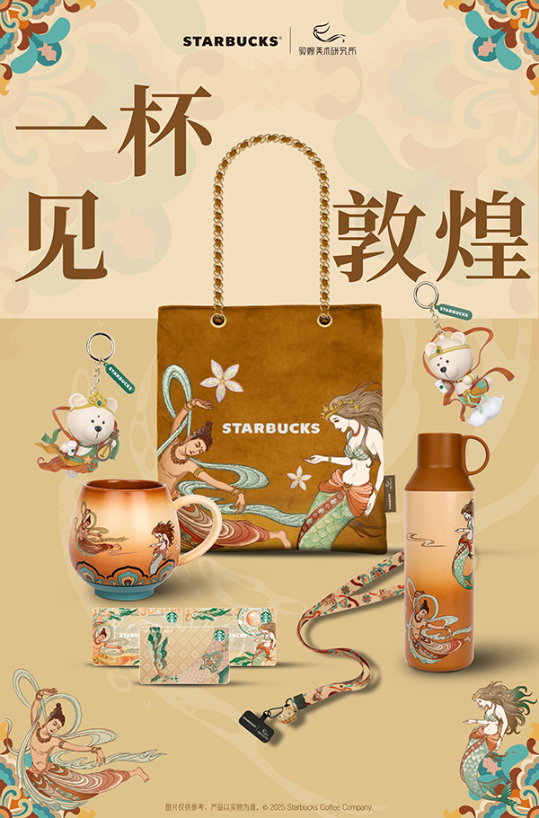 这套主题还是围绕着联名产品来的,它们有联名的马克杯和保温杯、两款“熊店长”、两张星礼卡和啡天丝路锦绳,设计上都体现了敦煌壁画、莫高窟、敦煌壁画中常见的陀螺花等与星巴克元素的碰撞,包括门店设计也是敦煌飞天和塞壬女神的互动。整个联名既有意义,也展现了传统文化十足的吸引力,非常值得拥有。