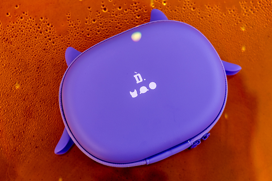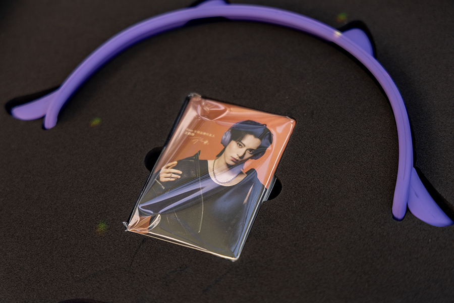 此外礼盒里还有专属的可拆卸紫色犄角耳饰和斜挎式头戴耳机包,以及限定联名贴纸 1 张和限定联名小卡一套 5 张。