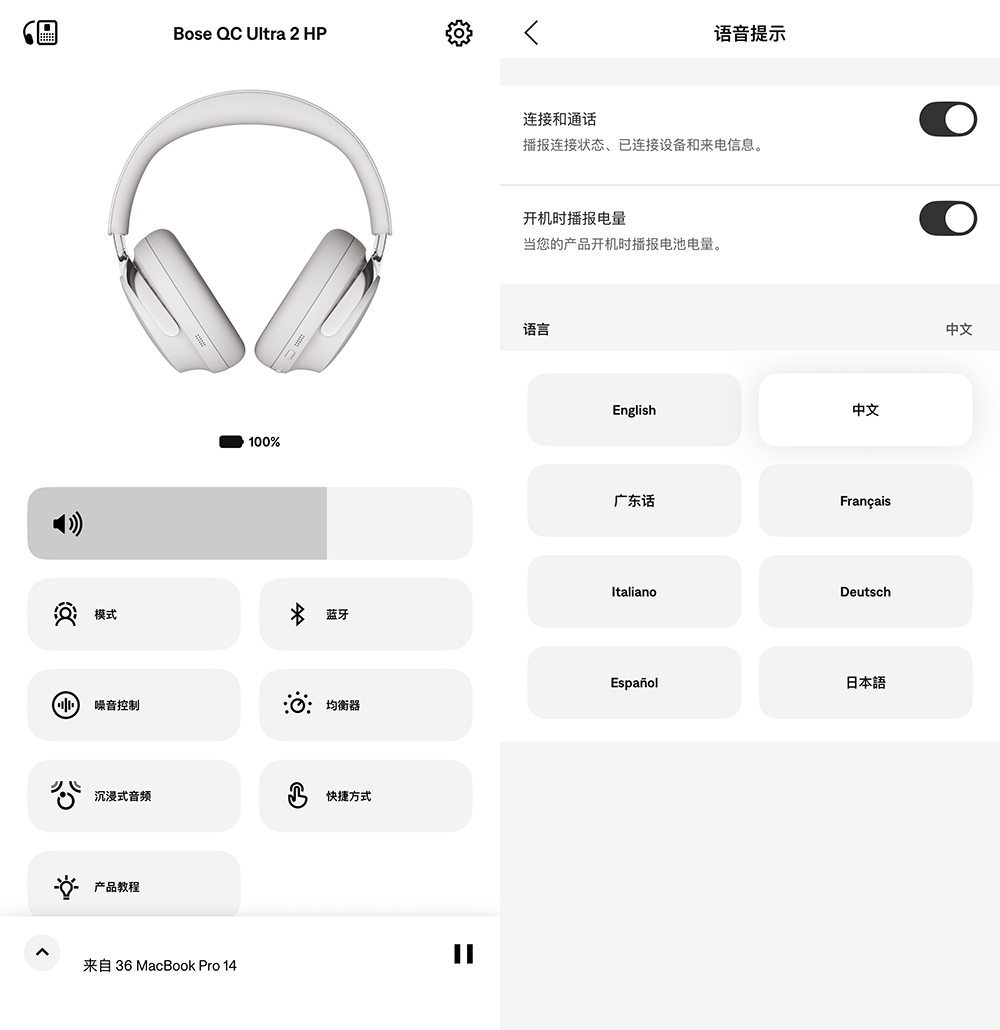 而目前提到的这些操作还都是独立于 app 来实现的,如果下载 Bose app(国内下载时叫“Bose 博士视听”),那将得到更完整的功能和设置选项:提示语音可以换成中文、可以自动下载和安装固件更新、有更直观的模式切换和均衡器调节……