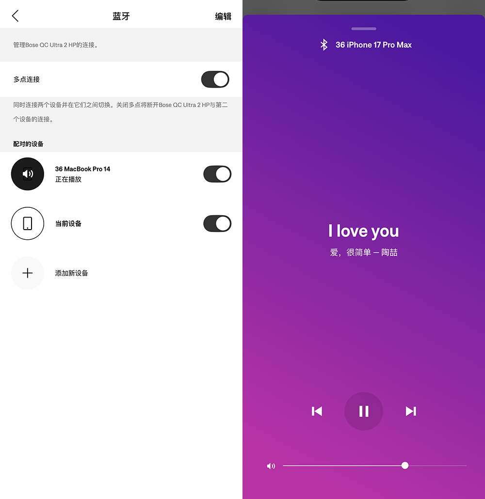 QC 消噪耳机 Ultra II 也支持和两台设备保持连接(一般就是手机和电脑连接了),这种切换是无缝的(前提是其中一个设备已经暂停了播放。如果同时播放的话,耳机只会听到最开始连接的那个设备的音频),非常方便。