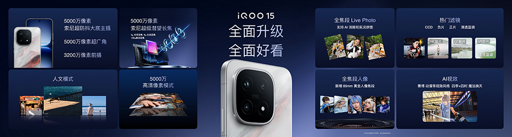 影像部分,iQOO 15 配备了 3200 万像素前置镜头,以及有 5000 万像素索尼超防抖大底主摄、5000 万像素索尼超级潜望长焦和 5000 万像素超广角的后置三摄组合,拍摄中有 NICE 算法和大模型画质增强双重技术加持,而全面升级的全焦段 LivePhoto、高像素模式、全焦段高像素人像模式和 AI 视效等也带来了更多的玩法和更大的创作空间。