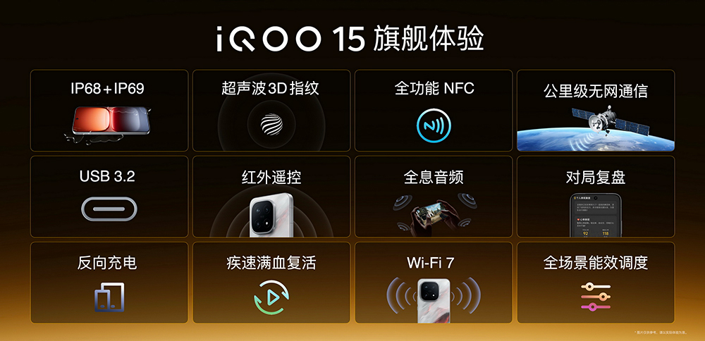 显示方面,自研电竞芯片 Q3 已经实现了“全场景光线追踪 + 2K 原画超分 + 144FPS 无损超帧”,这些还兼顾了低功效。同时 iQOO 15 搭载了包含“先知调度器”和“闪电加速器”的 Monster 超核引擎,做到游戏全流程的稳帧加速。iQOO 15 还行业首发了战锤 MAX 双轴振感马达,有全新升级 1511 战鼓大师对称双扬声器 Pro 并首发“游戏超感音域”,大大加强了外放空间音频效果和游戏细节音效的表现。