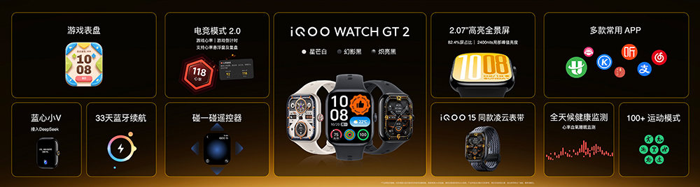 它支持了 100 多种运动模式,能记录心率、热量等数据,还提供了全新的电竞模式,以及有接入满血版 DeepSeek 的“蓝心小 V”等。它能实现全天候的健康监测,而续航最长达到了 33 天。