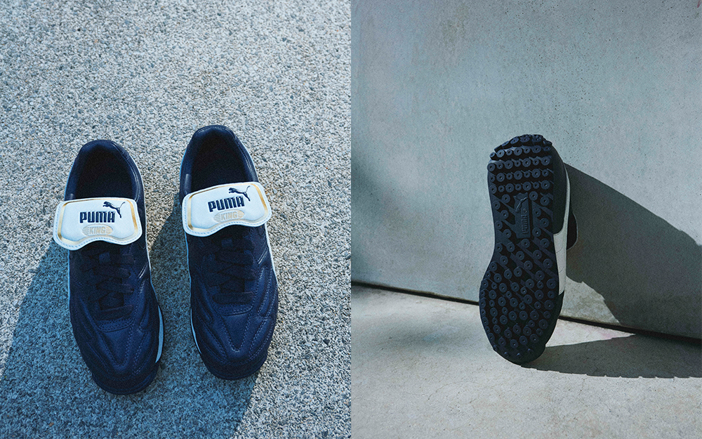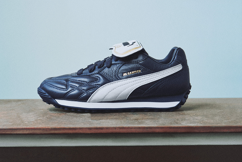 合作以 PUMA 的经典足球鞋 King Avanti 为原型,最终设计很大程度保留了鞋型本身的外观风格,它采用海军蓝搭配金色细节,皮革材质鞋面饰有标志性的缝线,鞋侧点缀了烫金的 JIL SANDER logo 表明身份,外底则采用了和鞋身相同的海军蓝,更具一体性。