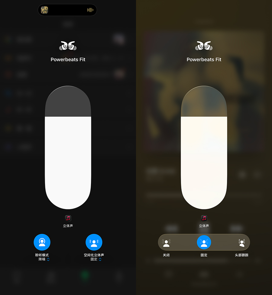 另外因为 Powerbeats Fit 耳机上只有按键,没有滑动的模块,如果要在耳机上调整音量,需要在设置里将按键改成“音量控制”,然后分别长按左右耳机上的按键来实现调低或调高音量。但一般来说这个按键我们会习惯设置成降噪和通透模式切换,二选一的话肯定是舍弃掉音量调整功能(在设备上管理音量即可)。
