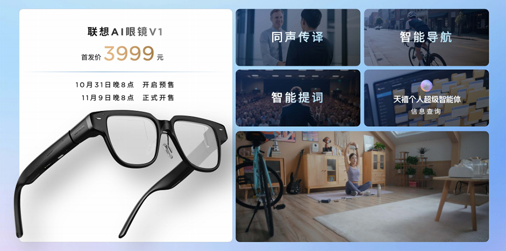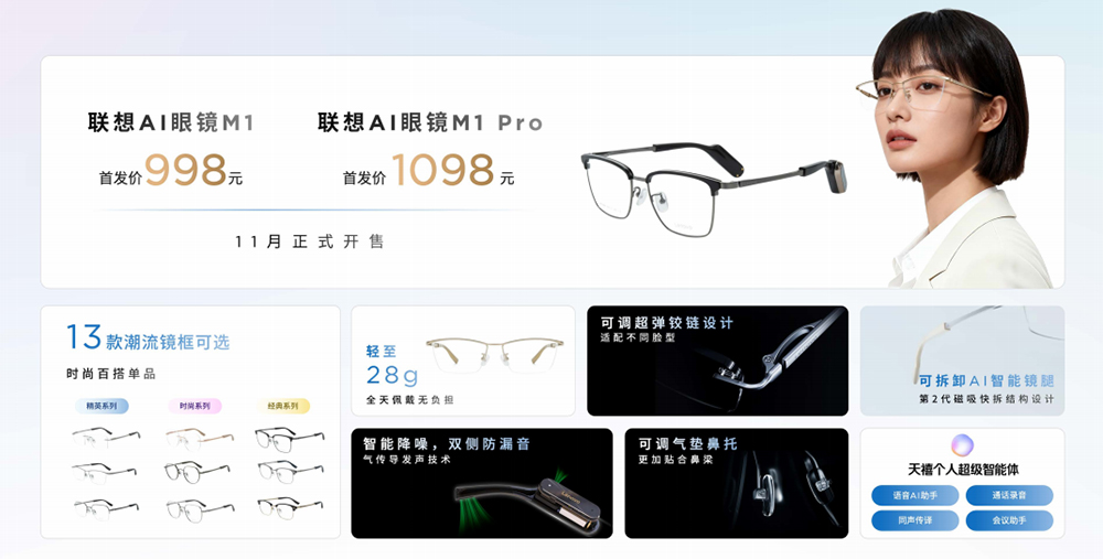 此外还有三款 AI 眼镜。联想 AI 眼镜 M1 和 M1 Pro 内嵌天禧 AI 能力,它们提供了实时翻译功能,也支持多种场景下的录音和会议纪要生成。它们的首发价分别是 998 和 1098 元。