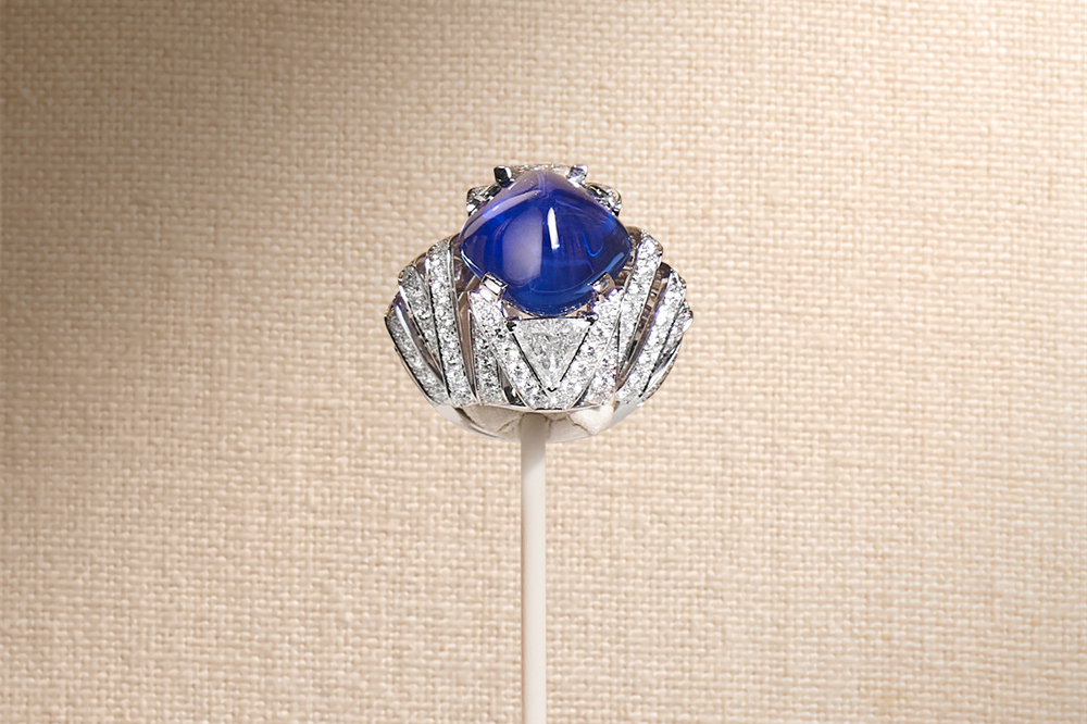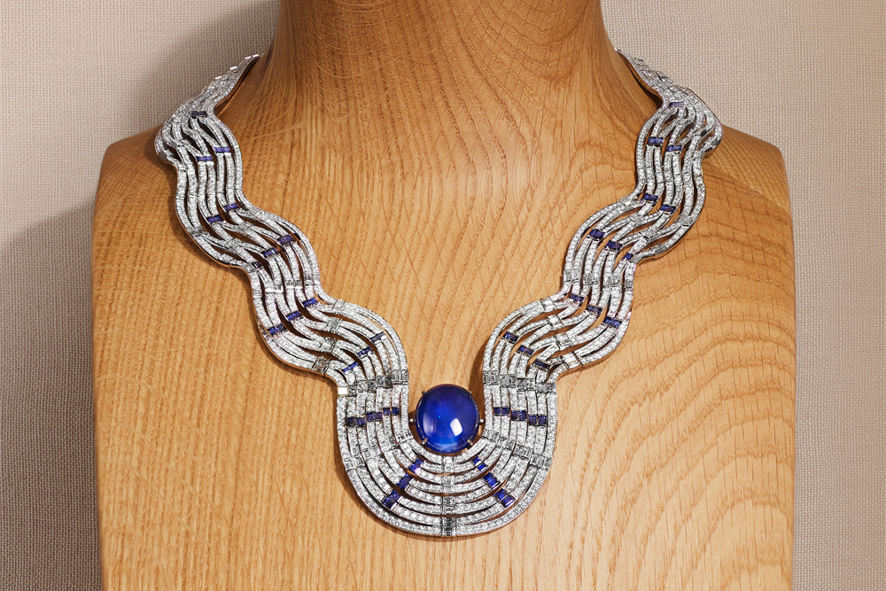 波浪造型的 HALIADE 高级珠宝项链,以柔软又富有韵律的波浪线条衬托一颗产自马达加斯加、重达 41.85 克拉的深蓝色蓝宝石,镂空设计与富有层次感的钻石和定制切割蓝宝石镶嵌演绎出水波光影。