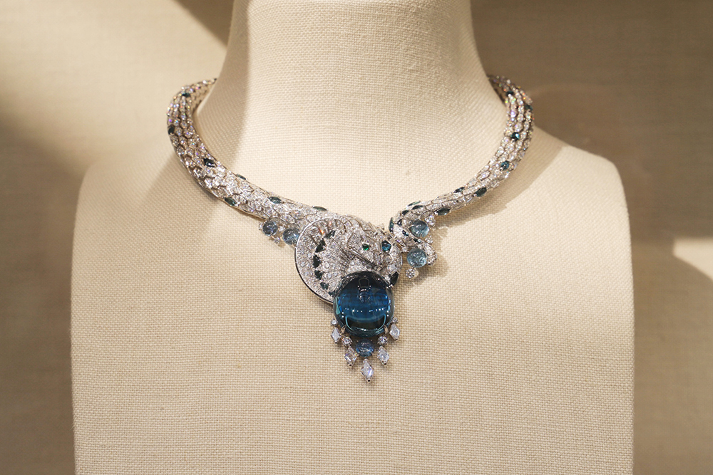 NAJAATRA 项链写实地诠释了眼镜蛇造型,镶嵌钻石的几何形鳞片闪闪发光,蛇首之下是一颗重达 51.70 克拉的海蓝宝石,整个造型富有立体感与生机。