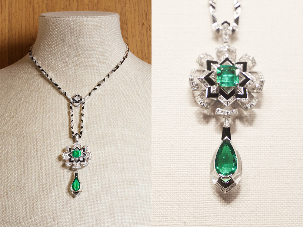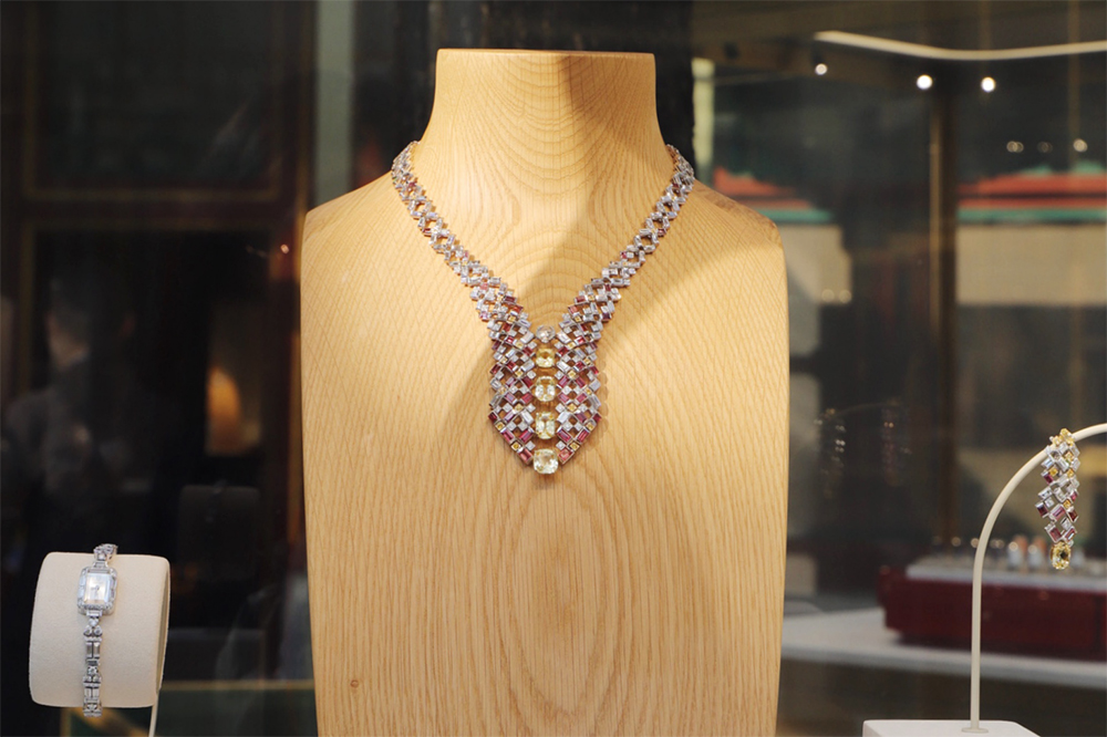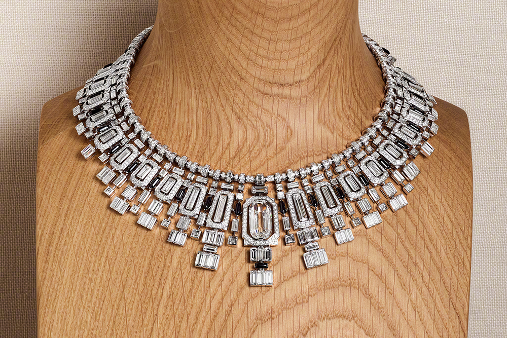 比如其中的 VETRATA 项链,其主石是一颗 8.15 克拉的钻石,整条项链的造型灵感便是从这颗钻石的切角长方形造型出发,搭配 20 颗形状相近的钻石,以放射状排布,突出几何造型的视觉冲击力,也致敬了品牌标志性的装饰艺术风格。