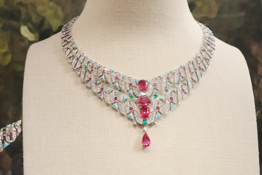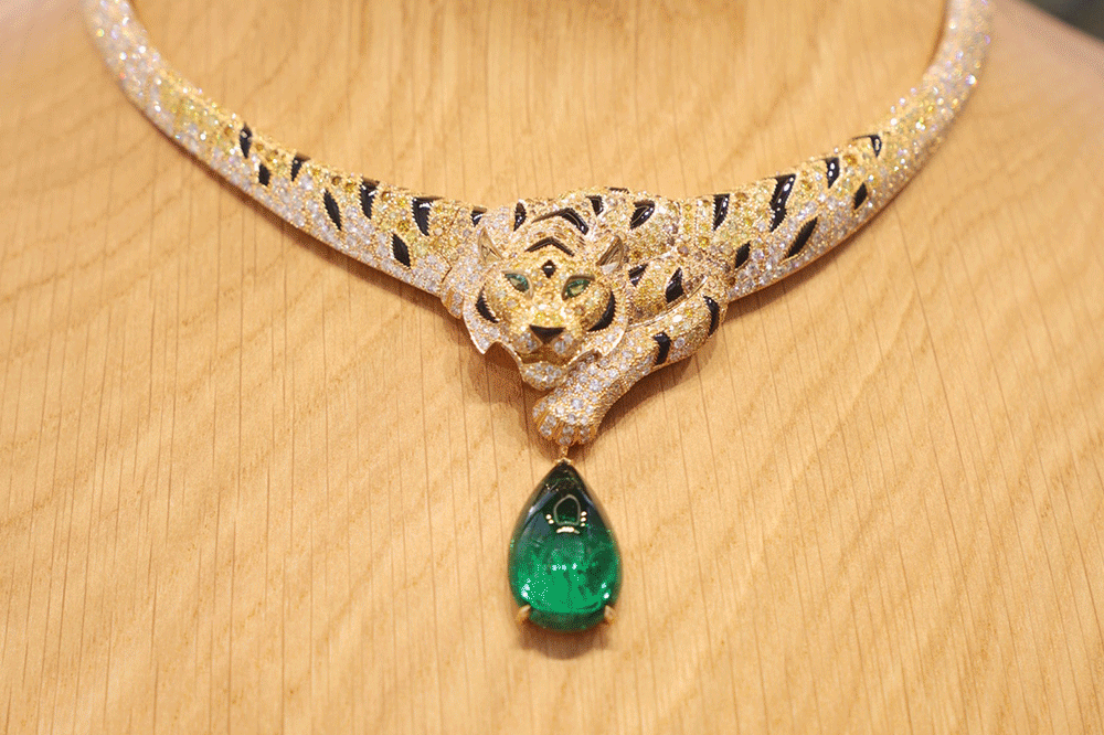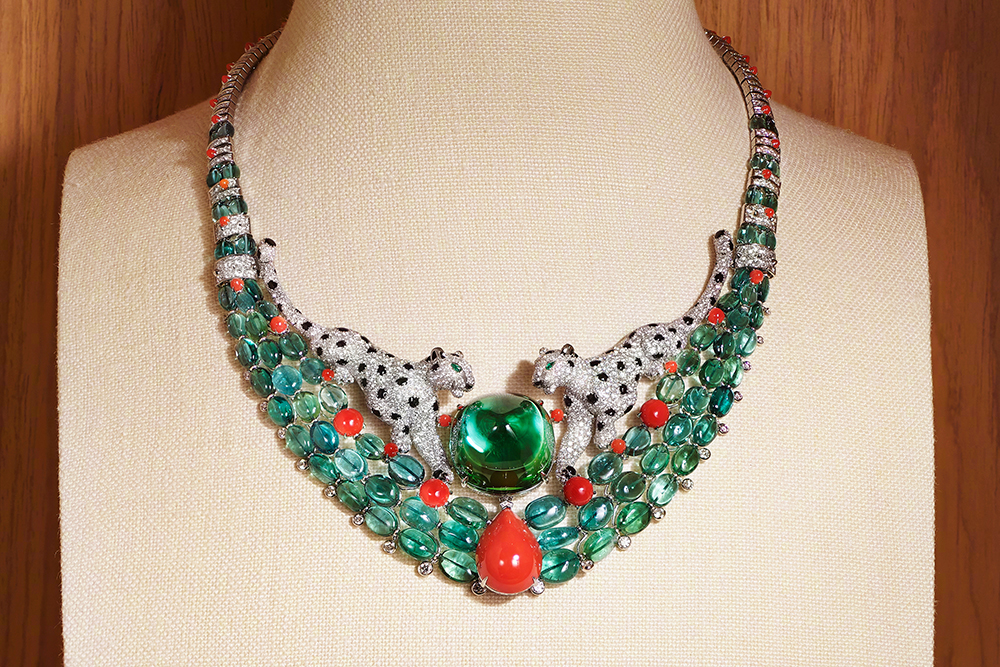 PANTHERES REFLEXIO 项链中两只镜像的猎豹相对而立,守护着一颗 74.10 克拉绿色碧玺和一颗 14.91 克拉水滴形珊瑚,富有生机的自然元素与几何对称结构以极为和谐的方式统一于这条项链之上。