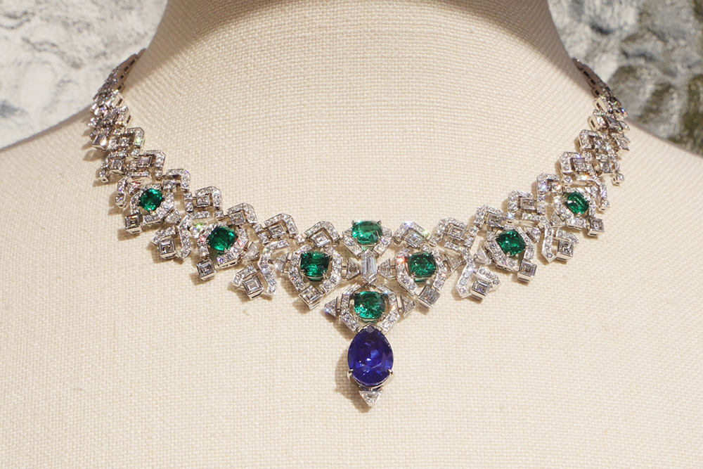 BYZAS 项链将一颗重达 11.70 克拉的斯里兰卡梨形蓝宝石和八颗总重 8.94 克拉的赞比亚祖母绿搭配,诠释品牌标志性的蓝绿色彩组合。