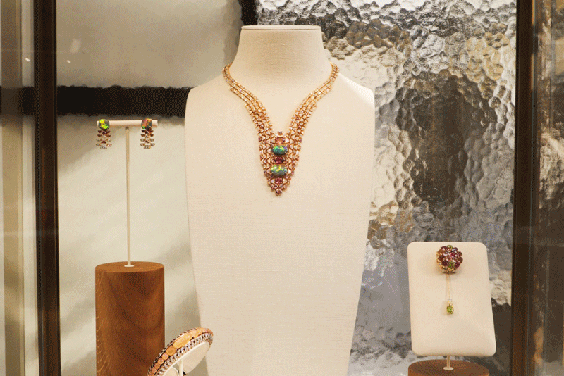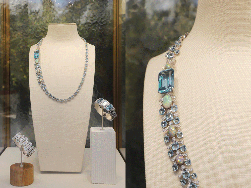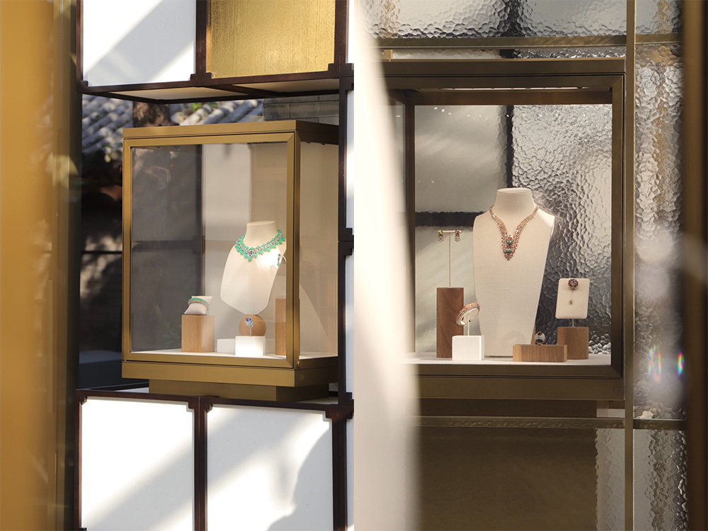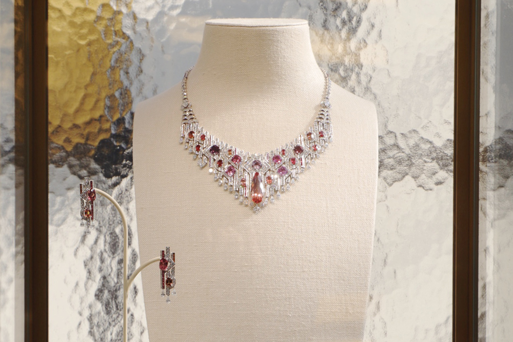 第一个篇章“色彩交融”,彩色宝石以不同的思路组合,或以细微的色彩变化展现色彩的律动之美,或以不同色彩的宝石撞色呈现大胆的对比之美……在庭院玻璃房的阳光下,宝石的色调尤显迷人。