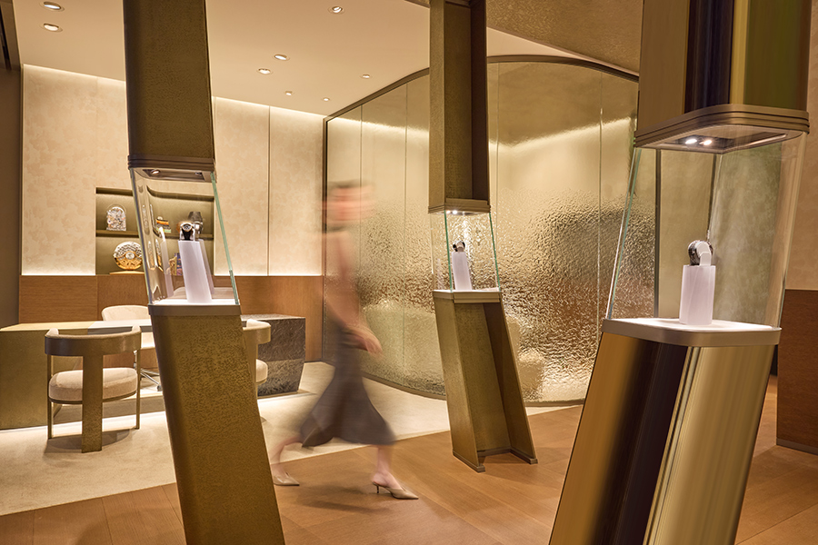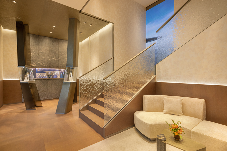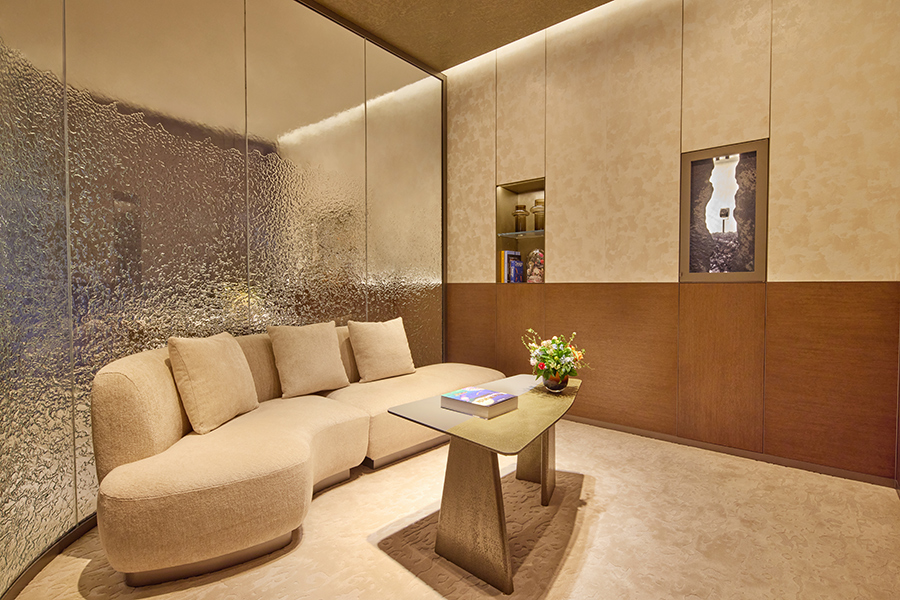 店内还通过仿佛流水的纹理玻璃隔开了不同的区域,每个区域都体现了舒适与私密性,顾客可以在静谧的氛围中了解并试戴产品。