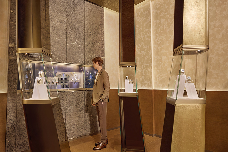 店铺有着临街的全景橱窗,通过通透的大型 LED 屏投射出动态的指针与天文主题视觉影像,来致敬带给爱彼制表师灵感的星空。进入店内,空间中以不同元素诠释了汝山谷的森林、流水、冰雪与岩石的意象,其中有极具雕塑感的树状装置融入了水晶材质展示柜,让腕表产品仿佛悬浮其间,也让大家可以近距离 360 度欣赏爱彼的高级制表技艺。