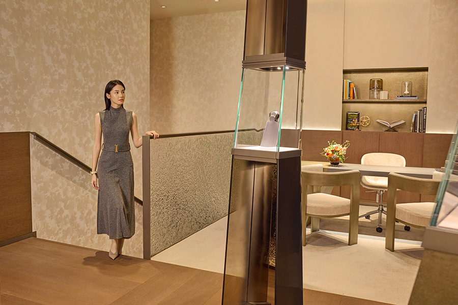 店铺有两层空间,一层主要负责产品展示,二层则主要负责销售、试戴环节并提供了 VIP 休息区。