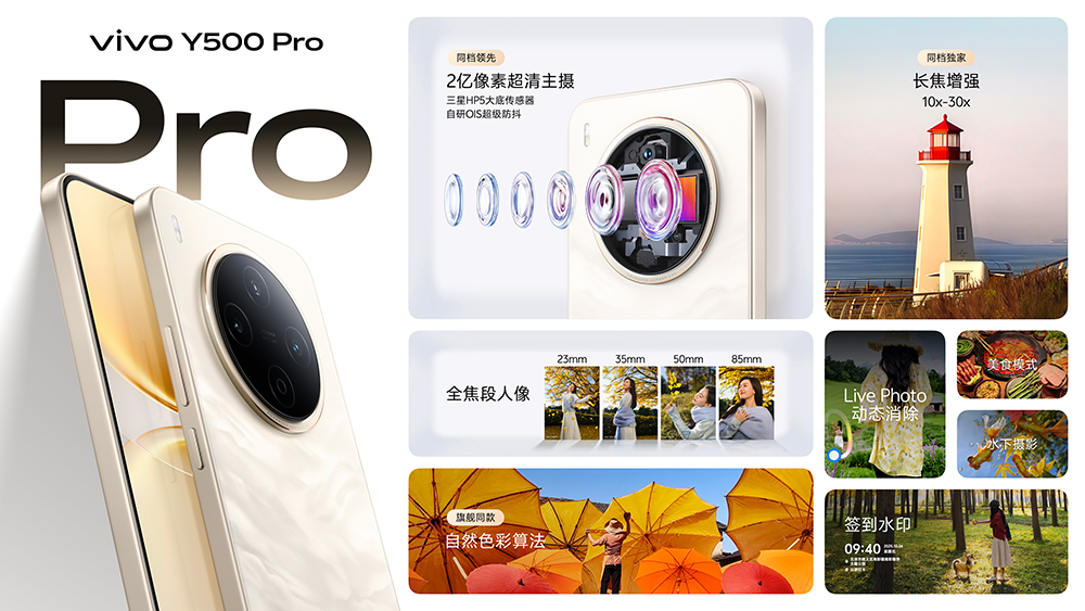 Y500 Pro 还通过 vivo 长焦增强算法带来了 10X - 30X 的望远能力,也提供了自然色彩、质感色彩、胶片风格 3 种色彩调校选项。它还有 3200 万像素的前置镜头,这会确保自拍、合照以及视频通话的清晰。