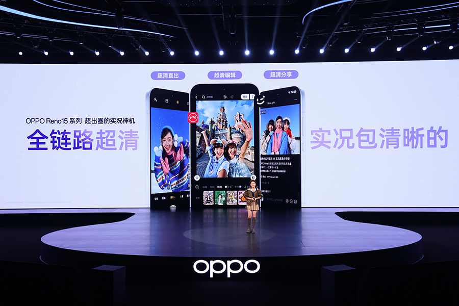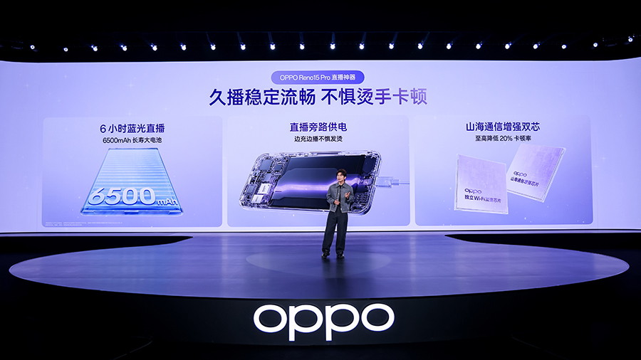 而在 Reno15 Pro 的部分,OPPO 提到了它“直播神器”的产品定位,要为主播提供一款可靠的干活工具。这是通过影像、收音、续航及网络稳定性等几个方面的加强来实现的。比如 Reno15 Pro 前置是定制 100 度超广角镜头,后置主摄有 OIS 光学防抖,实现稳定清晰的“走播”和跟拍,而内置原生三麦克风阵列加自研降噪算法,让 Reno15 Pro 也具备专业级收音效果。