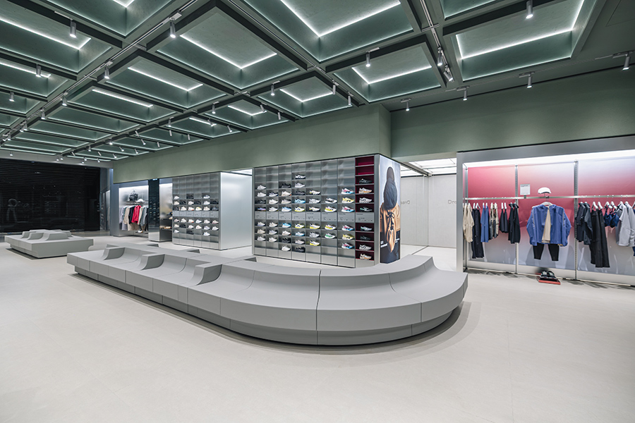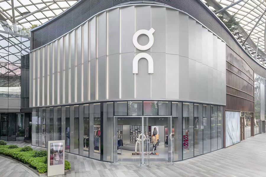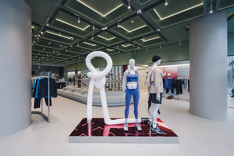 11 月 21 日,On 昂跑在广州天环广场开出新店,这是 On 在大湾区的最大门店。店铺设计融合了岭南自然意象和品牌美学,也从天河公园跑步路线中汲取了灵感,店铺外立面有着醒目的金属格栅,店内则有岭南藻井的结构并以灰绿和陶土色调呼应树影与土壤,也体现了跑步的节奏和呼吸感。
