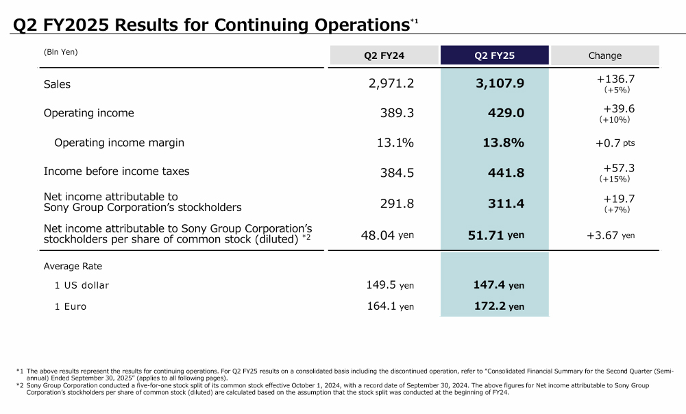11 月 11 日,索尼集团公司公布了 2025 财年第二季度(自然月是 2025 年 7 月 1 日到 9 月 30 日)的业绩数字:本季索尼实现销售收入 31079 亿日元,同比增长 5%;营业利润 4290 亿日元,同比增长 10%;净利润 3114 亿日元,同比增长 7%;营业利润率为 13.8%,同比提升 0.7 个百分点。