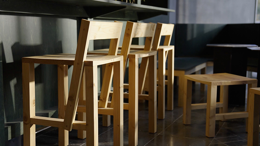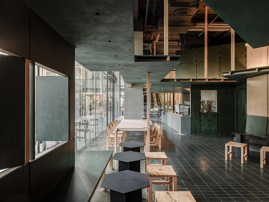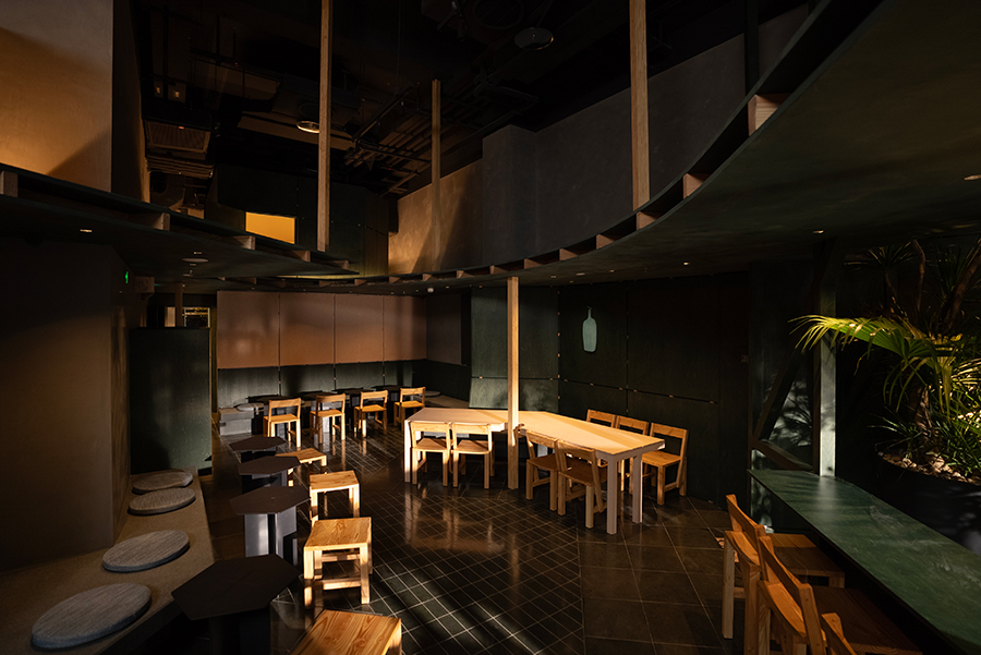 店内做出了不同的屋檐高度,也打造出了亭台楼阁般的错落感,并由此带来了特别的动线,大家则可以选择普通座椅、长凳、高脚吧台等不同的坐席。