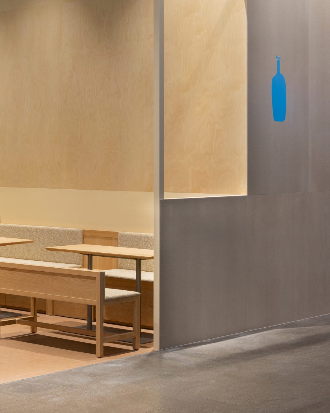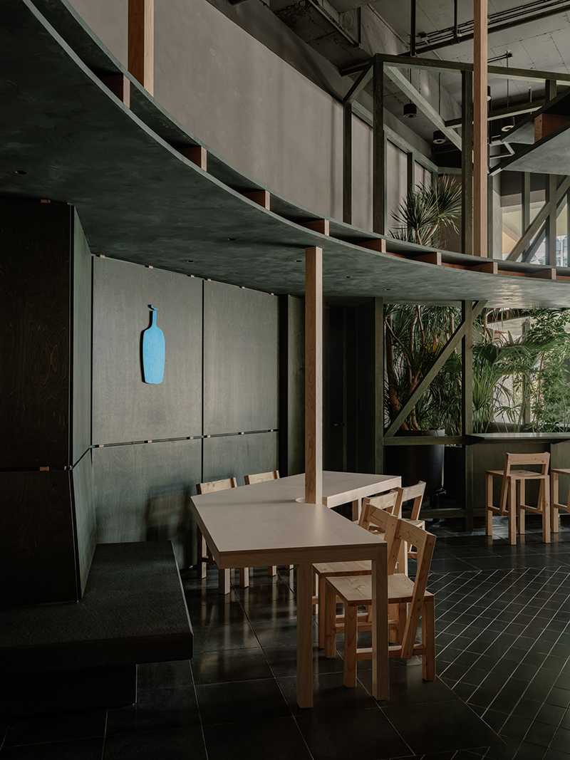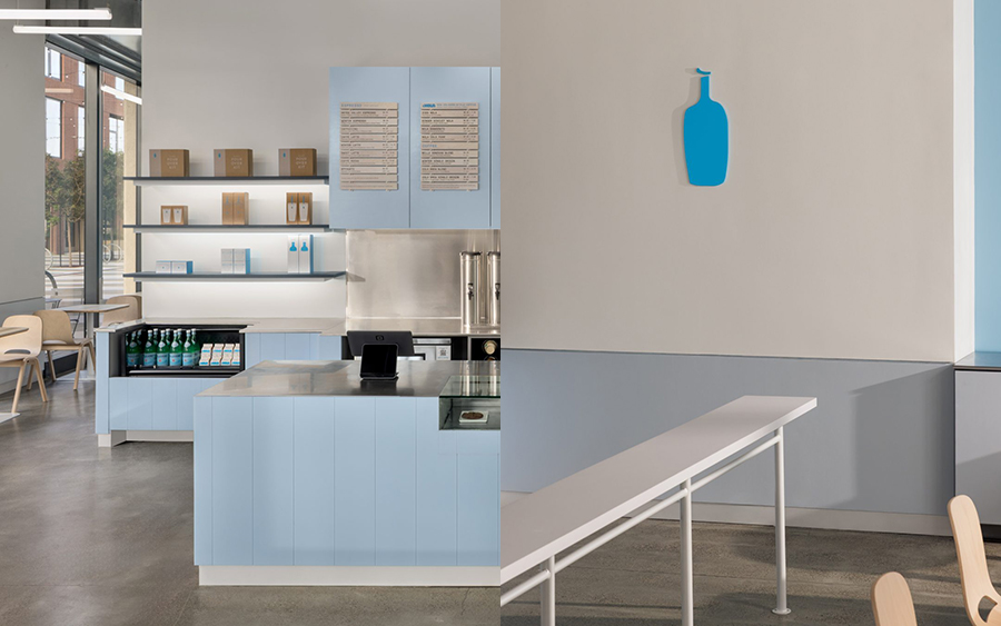 蓝瓶关注这个区域有一年时间了,最终带来的是一间现代风格的街角咖啡店,店内以淡蓝色为主打,有白色与金属元素的点缀,这套组合的灵感来自海浪和阳光下的波光粼粼。