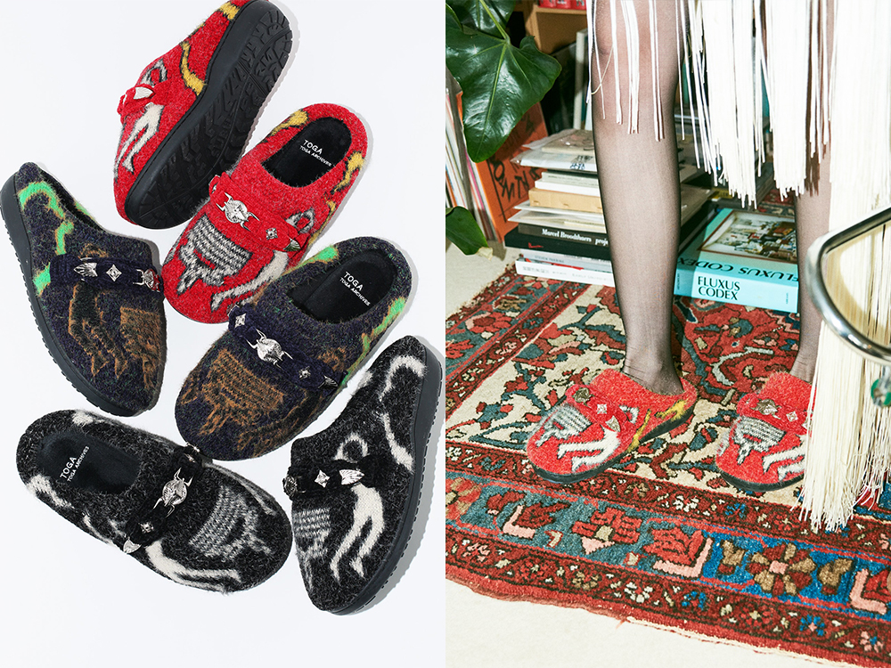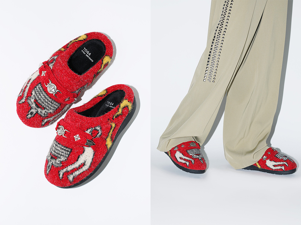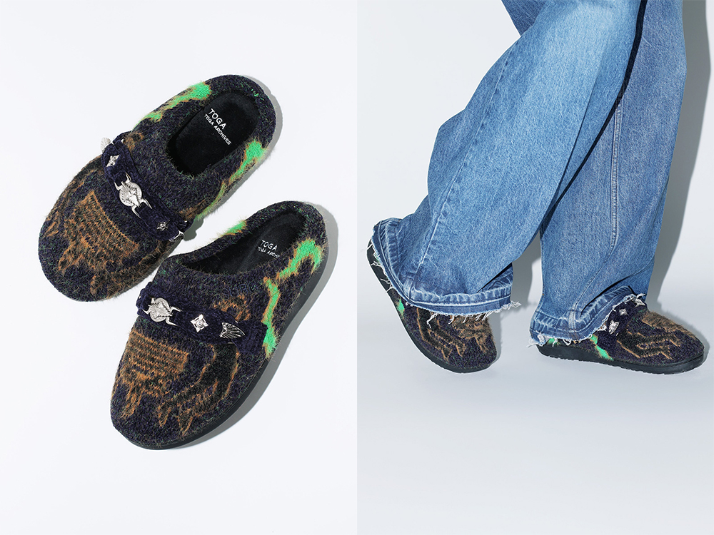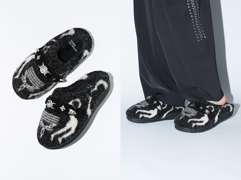 同样在本季迎来首次合作的还有 SUBU 和 TOGA,这一对的合作围绕 SUBU 的经典款冬季拖鞋展开,最终鞋款采用毛绒绒的针织面料制成鞋面,上面装饰了抽象的舞者图案,同时还有 TOGA 签名式复古金属饰扣。