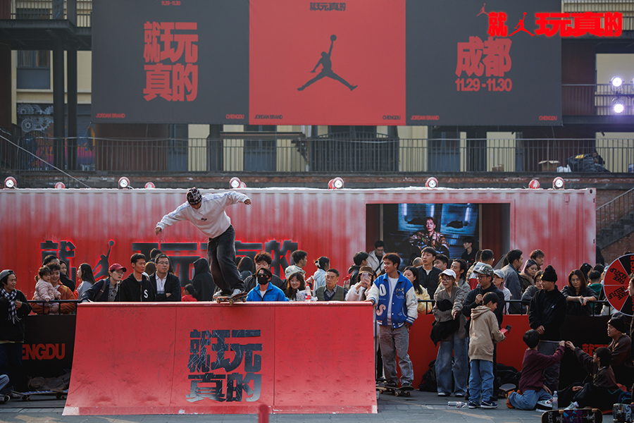 11 月 29 - 30 日,Jordan 品牌在成都东郊记忆带来了“就玩真的”主题活动,呈现了一场融合街头文化与运动精神的沉浸式滑板聚会。