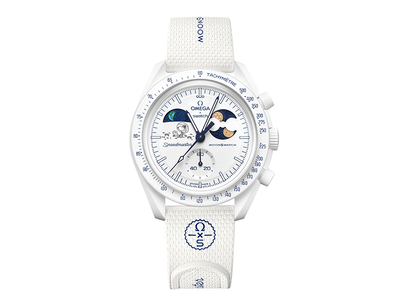 它延续了前代产品的表盘布局,有着欧米茄经典超霸系列月球表的各种特征,表冠上也有 OMEGA X Swatch 联名标志,以及灵感来自地球的电池盖设计。而在表盘上有史努比插画,有 Swatch 的地相指示器,也有饰有欧米茄 Moonshine 18K 金的月相指示器,并且每枚腕表的月相显示都镭射雕刻了专属的雪花图案,这呼应了自然界中的雪花都有独特的细节。