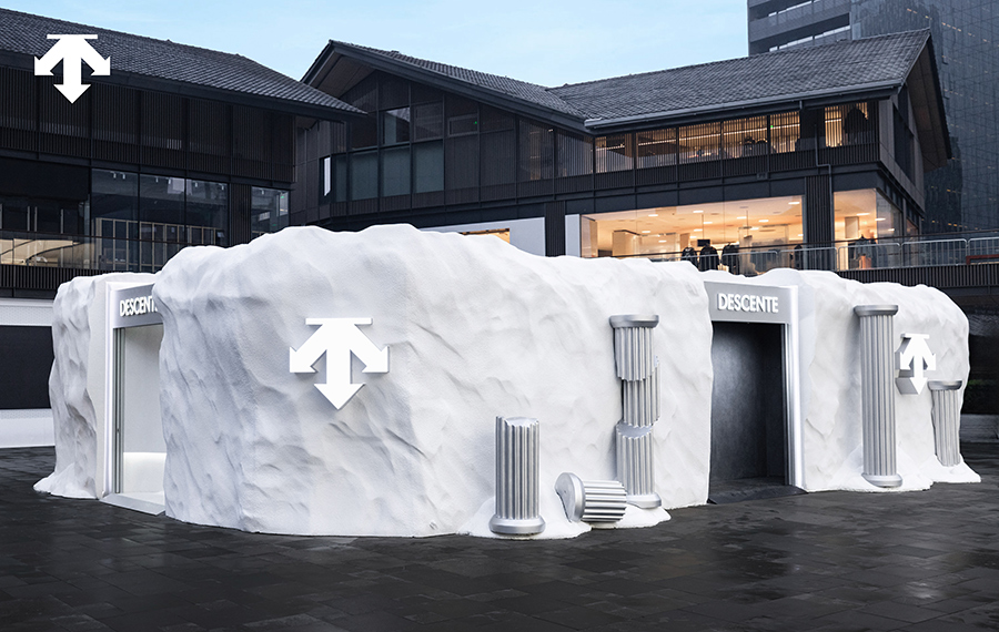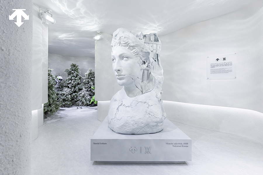 这次还有个特别看点,今年雪季迪桑特和 Daniel Arsham 合作带来了以“冬日山野”为灵感的全新联名系列,这在之前上海展时做了预告,现在则已经完整呈现,在成都站,展览最后一个区域做成了特别的联名主题冰雪空间,当中展出了 Daniel Arsham 为这次合作特别创作的雕塑《Victoria Labyrinth》,它延续了艺术家的美学,也和雪景、联名系列的冰雪机能做了融合,也是在观展的结尾为大家准备的惊喜。