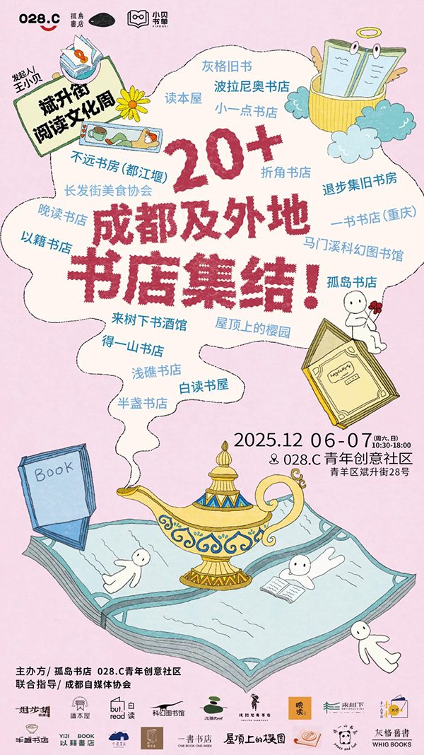 同时在这个周末两天,斌升街的 028.C 青年创意社区会有“斌升街阅读文化周”活动,将有超过 20 家成都本地和外地的书店聚集到这里,将会为大家带来折扣书、特价书乃至各种赠品之类的福利,此外或许也能淘到签名书和限量书等等。