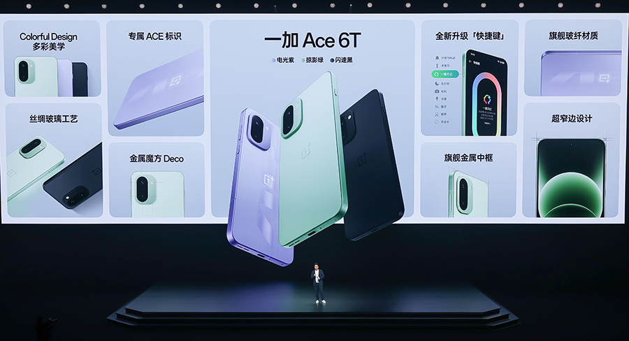 外观方面,Ace 6T 延续一加家族设计,并采用 Colorful Design 多彩美学设计语言,它有“金属魔方”Deco 搭配微弧金属中框,屏幕则是超窄边,整体兼顾了视觉的简约和舒适的握持手感。它有“掠影绿”、“闪速黑”和“电光紫”三种配色,其中“电光紫”不仅采用了轻盈的玻纤材质,还有着独特的 ACE 标识。