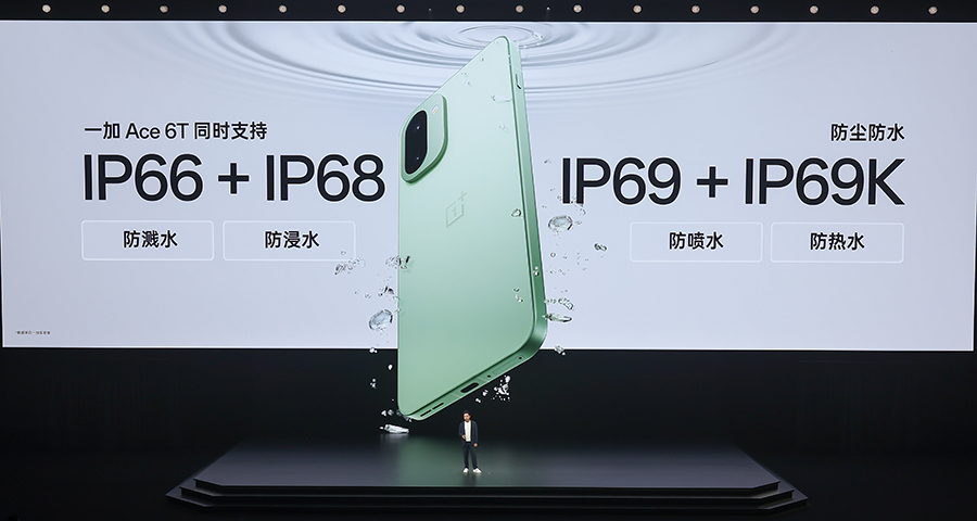 Ace 6T 的机身也有着十足的强度,它采用了 OPPO 晶盾玻璃,确保抗摔性和抗刮伤性,同时它还具备了 IP66/68/69/69K 的满级防尘防水能力,也是市面上最高的一档,日常跌落、下雨天溅水使用等都不在话下。