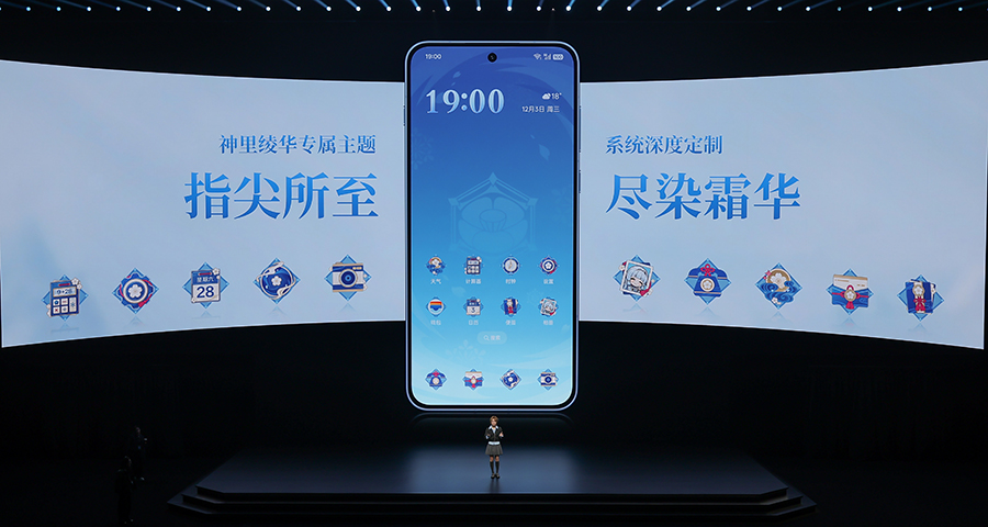 比如机身采用的是角色同款“雪雾蓝”限定配色,并雕琢了“白鹭公主”专属背板纹样,而开机后,从应用图标、动效动画到音效铃声都深度融入了神里绫华的角色元素,带来沉浸式的使用体验。