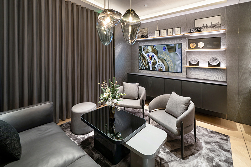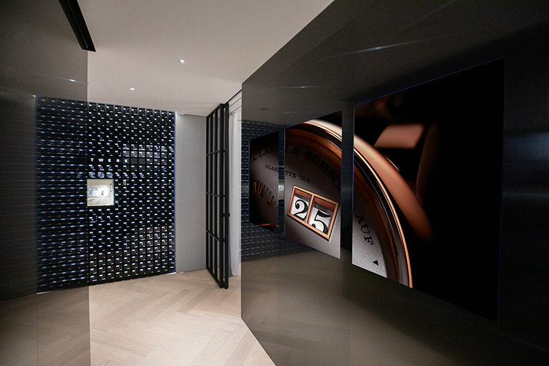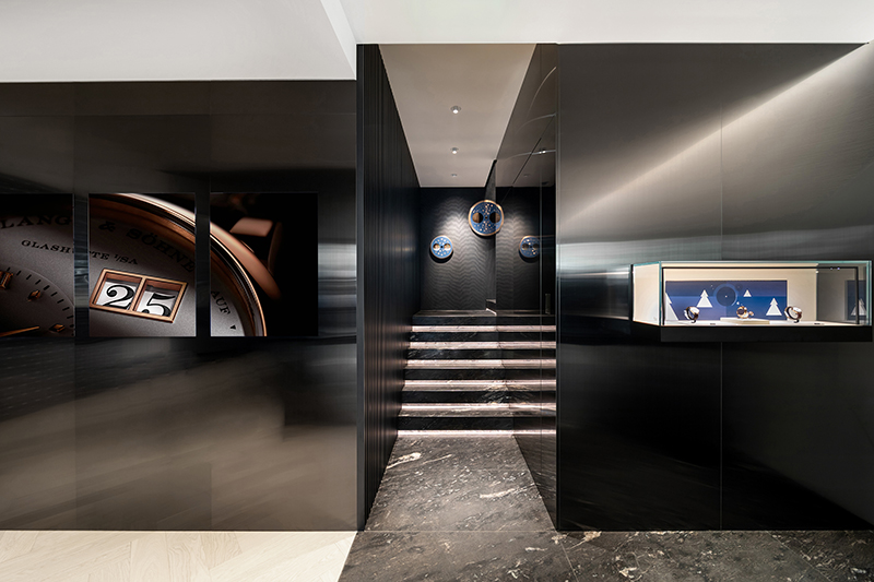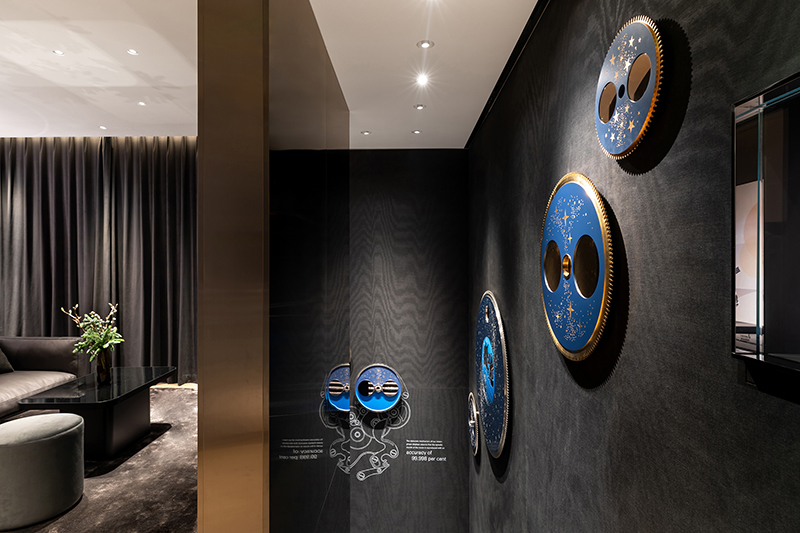 其中一楼主要是产品与品牌历史展示,这里带来了朗格六大腕表系列,同时也有旗舰店特别款腕表及其它精选腕表可供选择,二楼则提供了更私密和专属的贵宾空间,让客人可以沉浸式地进行产品品鉴。店内还有各种细节,包括我们熟悉的机芯墙,以及楼梯间墙面的立体月相盘等都可以留意,此外店内还准备了专属吧台,可以为顾客提供定制化的饮品服务。