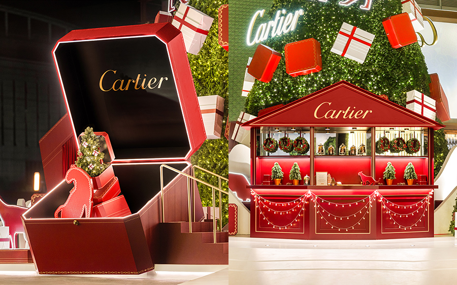今年的装置由圣诞树和环绕在它周围的一系列小装置组成,品牌标志性的红盒以及猎豹等元素大量出现,它们带来了充满辨识度的品牌美学,加上卡地亚的红色也相当的喜庆,充满了节日的气氛。