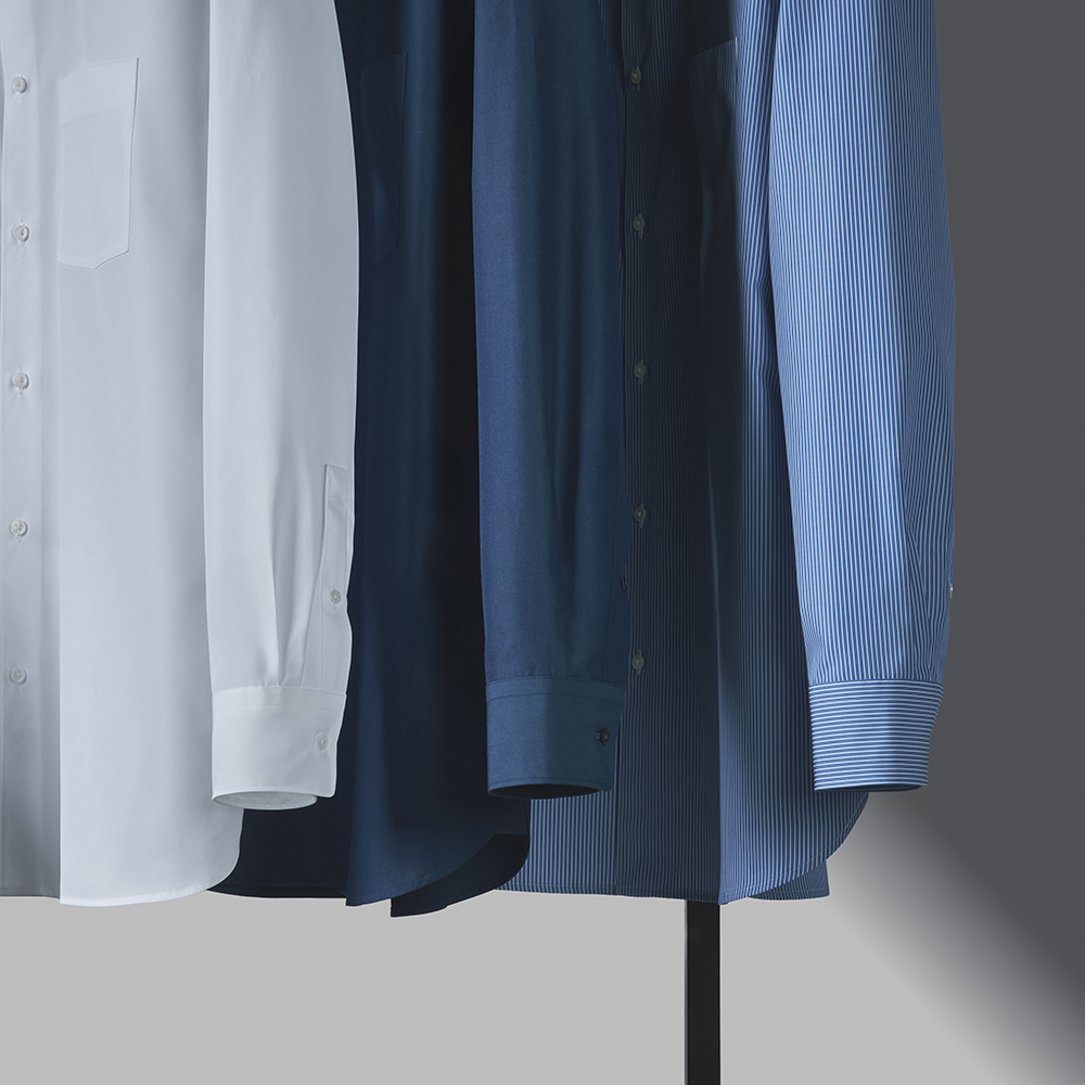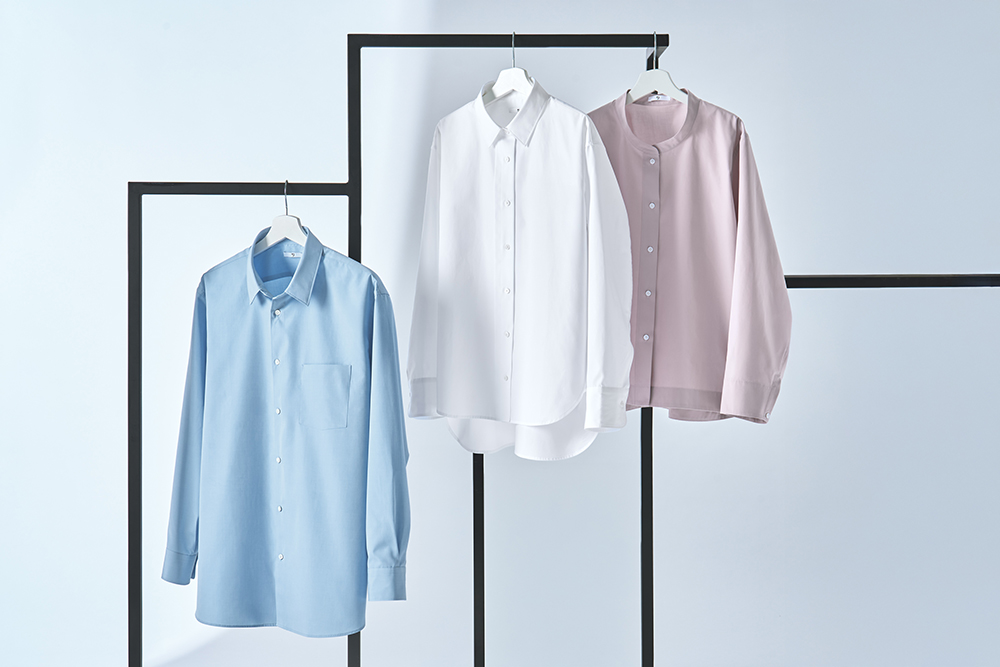 这次的 3 款衬衫分别是小立领的夹克式衬衫、下摆前短后长设计的宽松衬衫,以及胸前配有口袋的全棉衬衫,它们的色彩以简约的白色和不同色调的蓝色为主,部分单品也有条纹款。
