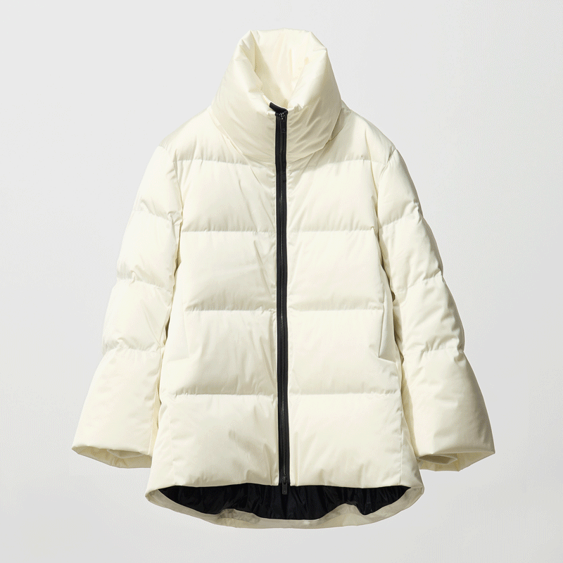它在穿着中可以有多种形态,比如拉链拉到顶部以后是包裹感的大立领,拉链放下一些则是大翻领,呈现出完全不同的风格气质。另外羽绒服的下摆有抽绳,收紧后就会变成茧型,这些都给造型带来了很多趣味。