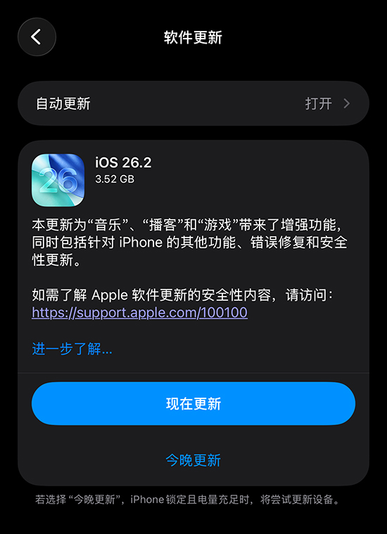 12 月 13 日,苹果推送了 iOS 26.2、iPadOS 26.2、macOS Tahoe 26.2、tvOS 26.2、watchOS 26.2 和 visionOS 26.2 正式版系统更新。