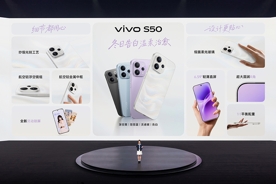 这次 S50 系列主打的新配色是“告白”,它是在缎面柔光玻璃背板上引入全新纱缎光刻工艺,实现了“白里透金”的细腻的视觉效果,同时还触感温润且不沾指纹。