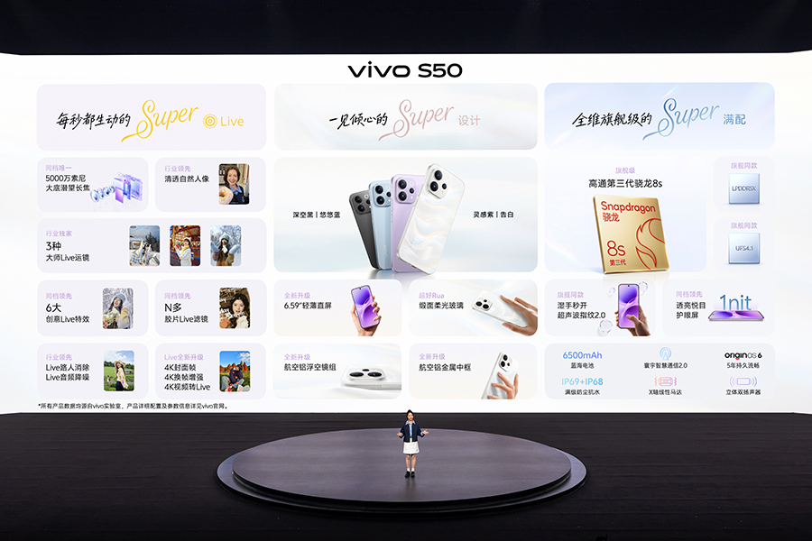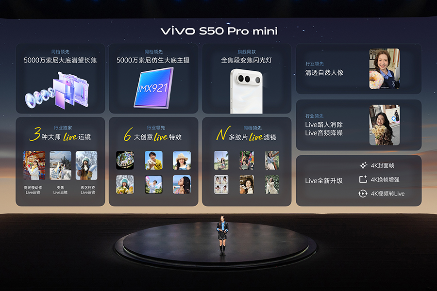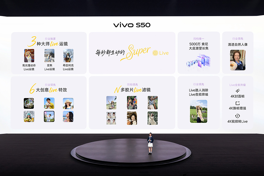 这次 vivo 特别强调了 S50 系列“长焦 Live 神器”的功能定位。基于索尼 IMX882 大底潜望长焦,S50 系列能实现最高 10 倍变焦,并结合 vivo 自研原像引擎与大模型画质增强算法,来兼顾远景、逆光和复杂光线下的画面纯净度和细节表现。