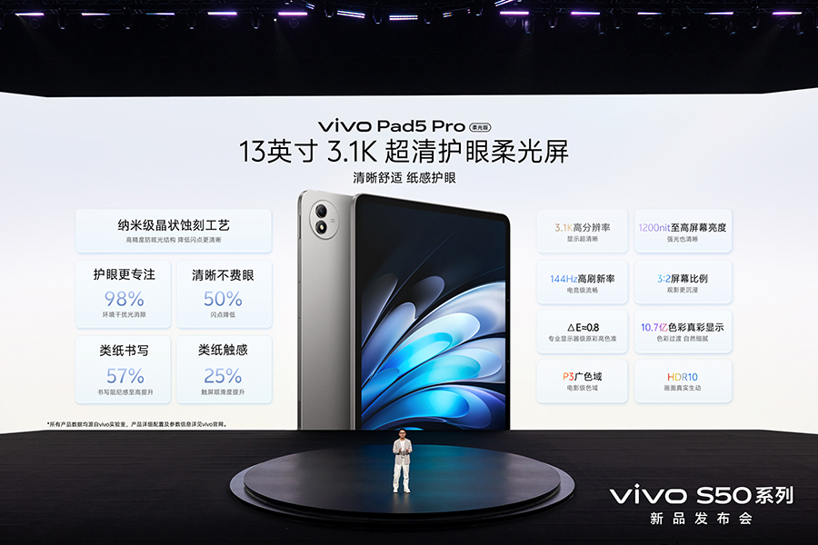 这次一起亮相的还有 vivo Pad5 Pro 柔光版,它基于今年 4 月发布的 Pad5 Pro,而屏幕换成了 13 英寸 3.1K 超清柔光屏,从而减少眩光,让画面更加清晰舒适。它也继续搭载蓝晶 x 天玑 9400,并支持 PC 级 WPS、定制 CAJViewer 等使用,加上 8 扬声器全景声 HDR 影院效果,实现学习、娱乐和工作的兼顾。