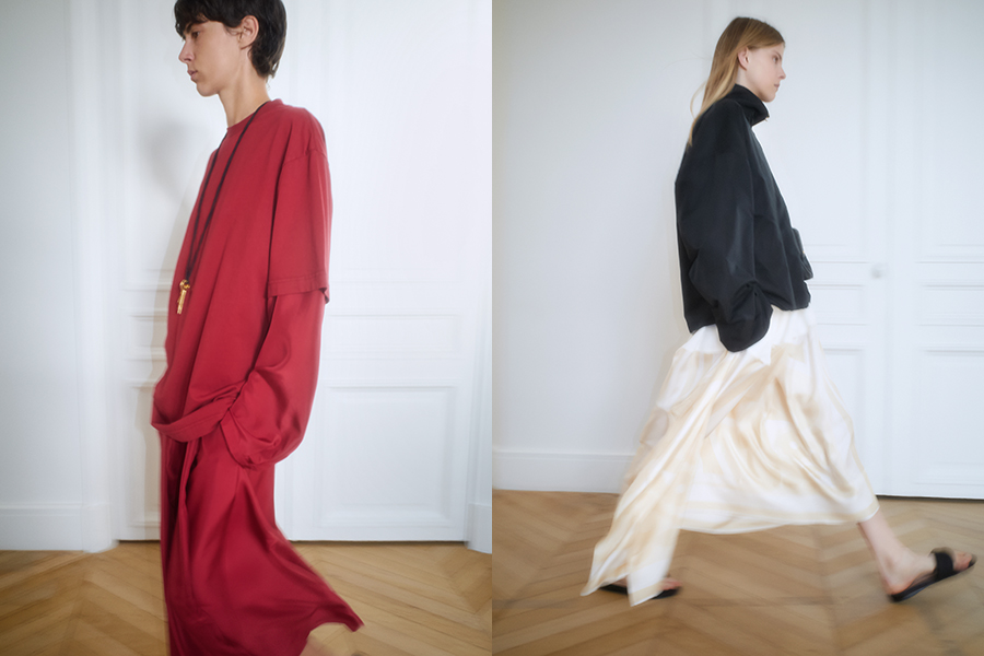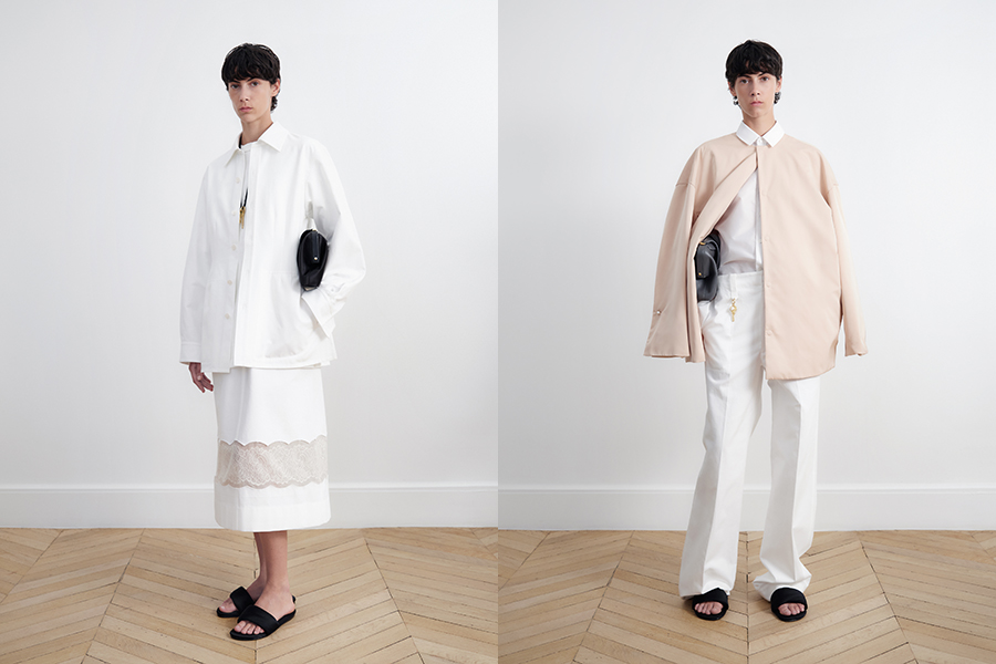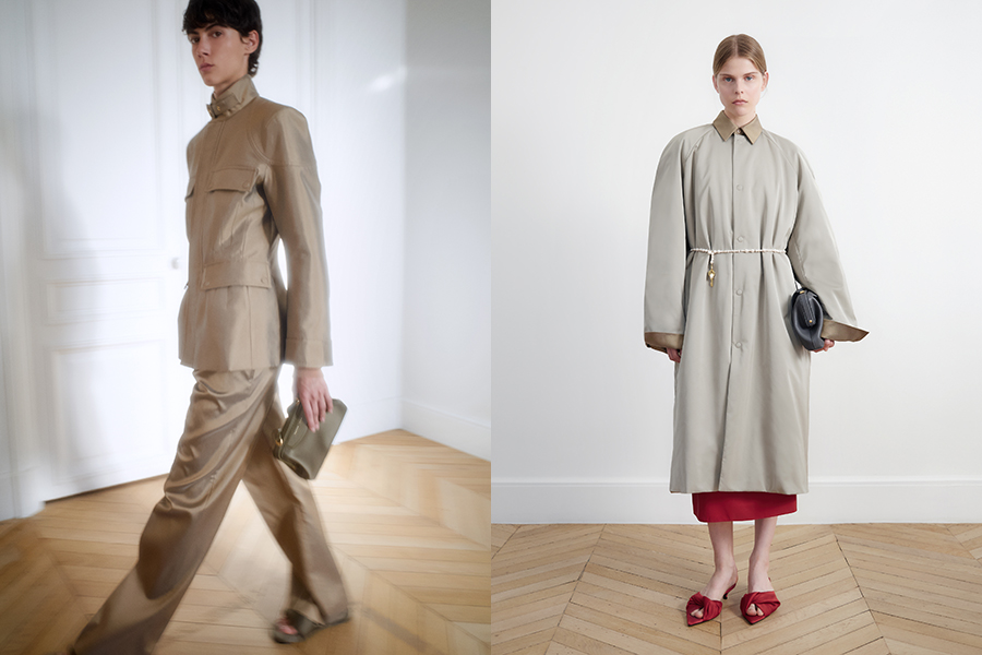 在其中的 2026 早春系列中,Carven 保持了对“Esperanto”廓形的探索,它在风衣、军工夹克、针织等外套上做了应用。同时系列将睡衣元素融入到了日常穿着中,实现内里设计外化,并有舒适的填棉加上真丝缎面表面,带来柔和舒适的穿着体验。此外还有垂坠的真丝电力纺裁作了连衣裙和上衣,以及古董丝巾被应用在了连身裙的饰边,这些细节也都实用且有趣。