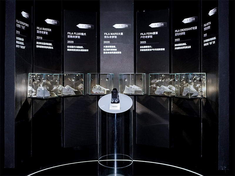 空间呈现了 FILA VETTA 全系列产品,同时也做成了对 FILA“老爹鞋”产品线乃至整个“老爹鞋”文化演进和回顾的展览,现场以“风格时序”、“智酷新生”和“自成境界”三大沉浸式章节,带大家从“老爹鞋”的历史、设计溯源一路走向这一品类的现在与未来,亲身感受不同的设计与风格表达。