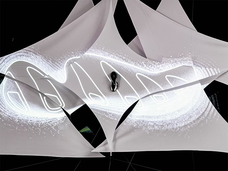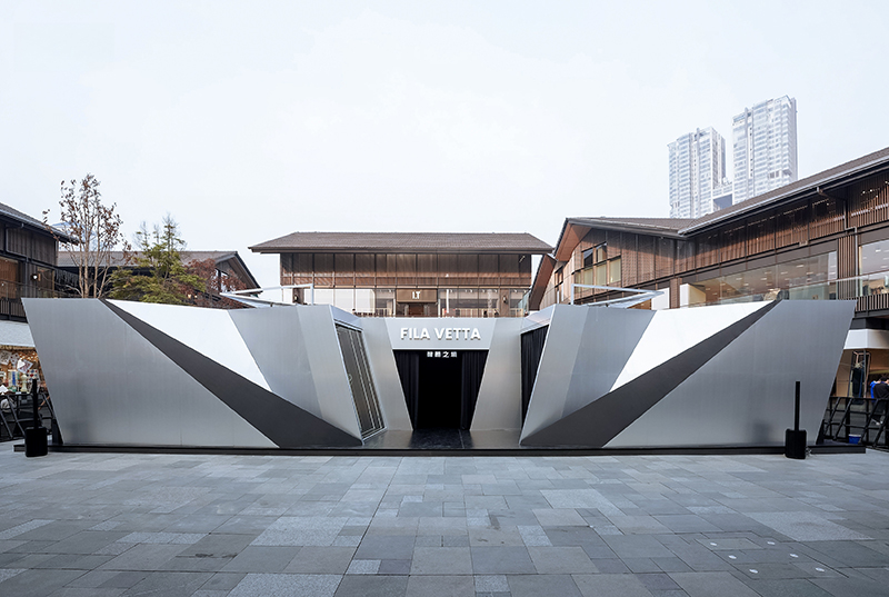 限时空间是为 FILA VETTA 系列打造的,整个建筑采用 V 形美学设计,这是将 FILA VETTA 鞋款标志性的 V 形设计语言进行了元素提取和解构,从而带来了“智酷之境”空间的外观,加上以金属银为主色调以及可反射环境光的金属结构材质,让空间未来感十足,在成都太古里都非常有辨识度。