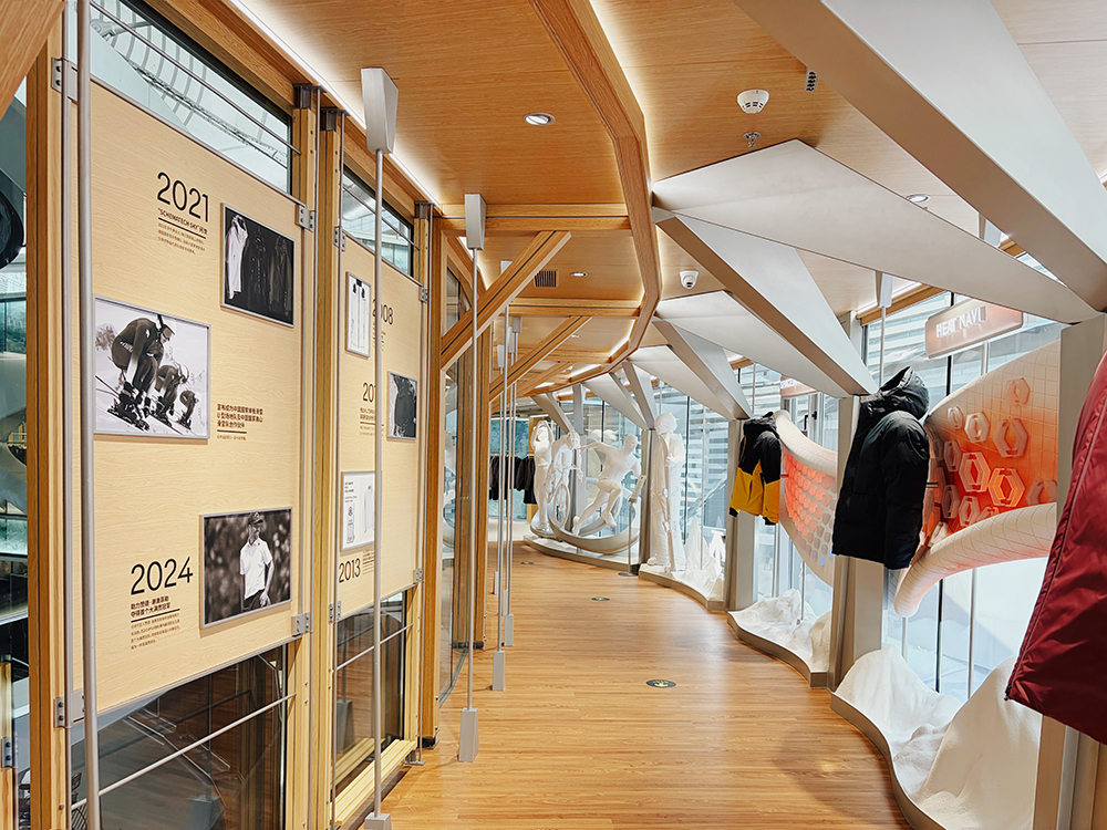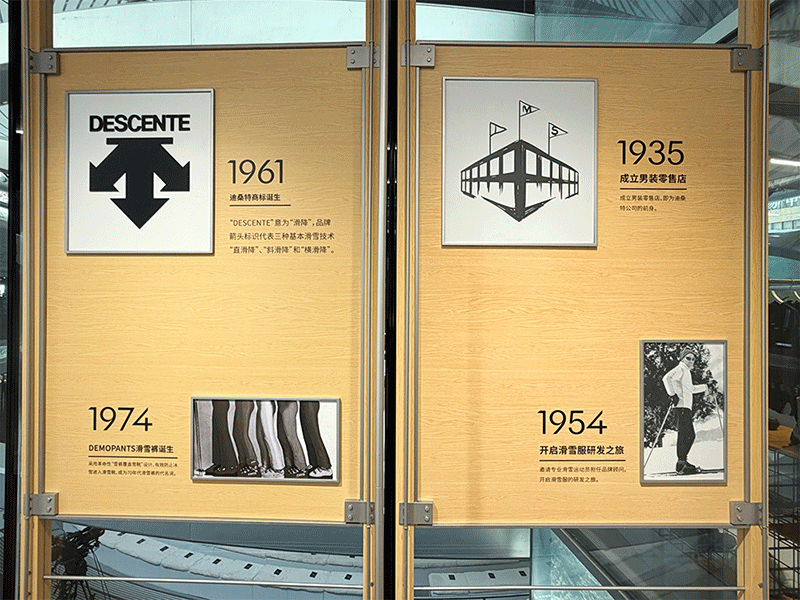 逛过“专精之域”,走进二楼的连廊,它的一侧是历史长廊,记录了迪桑特不同时期的里程碑事件,另一侧则展示了品牌的多项服装科技。