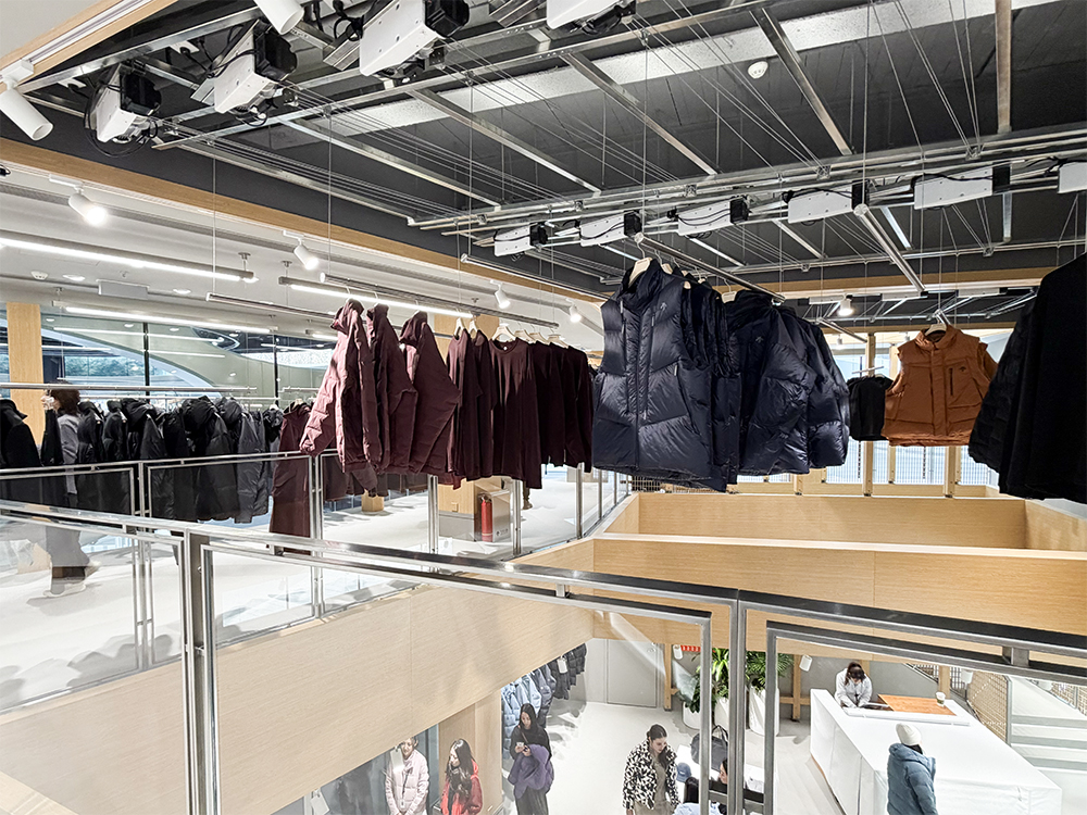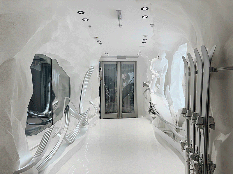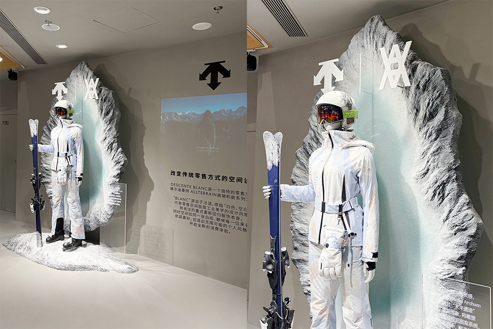 其中“专精之域”空间聚焦品牌的滑雪基因,这里陈列了品牌滑雪系列及铁人三项、综合训练等领域的装备,一楼是女装,二楼则有男装、鞋履和 DUALIS 系列。室内设计通过雪洞、缆车、指示牌等装置,营造出雪山的氛围感。