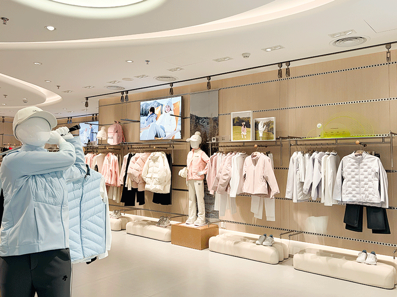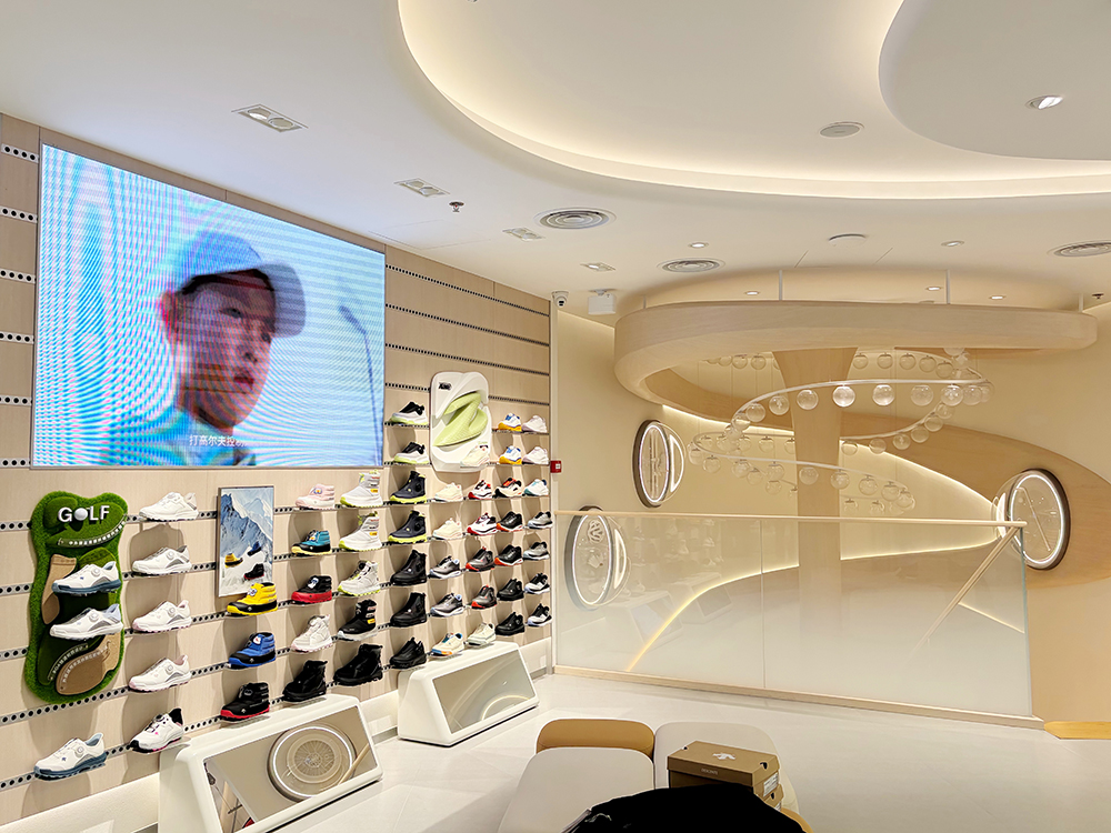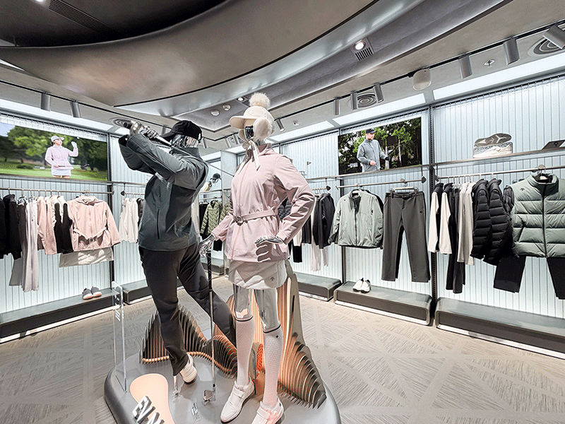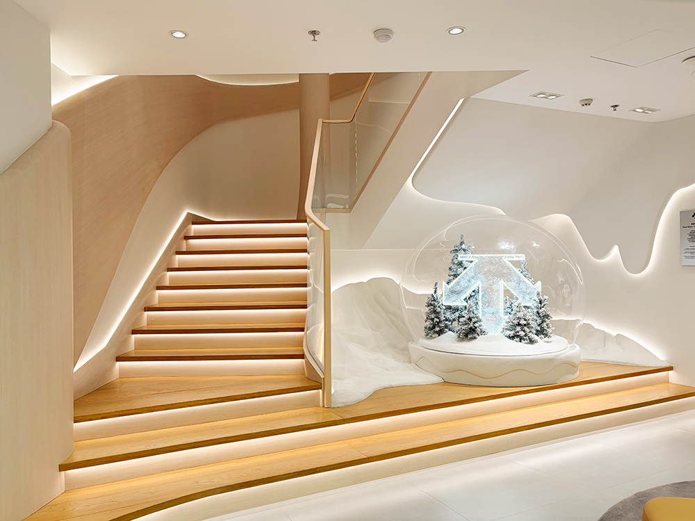 这家店铺的体量达到了 1600 平方米,共两层,也因此有许多可以发挥的空间。迪桑特为全品类专精、高尔夫、BLANC 及儿童系列分别设计了主题空间,每个分区都打造了沉浸式的场景。